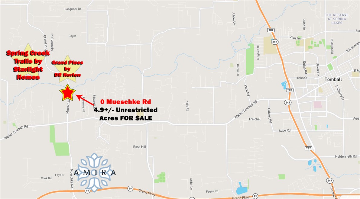 Excellent opportunity to own 4.96 acres of unrestricted land with approximately 349 feet of frontage along Mueschke Road, just minutes from FM 2920 and with quick access to Hwy 99, Hwy 290, and Hwy 249. This high-visibility tract sits elevated above street level on a curve in the road, offering strong exposure for any commercial use. Located in a rapidly developing area near the newly announced master-planned communities, this site is not in a flood zone and is just minutes from Tomball, Cypress, and Waller. The surrounding growth and flexible land use make it ideal for a wide range of development opportunities.