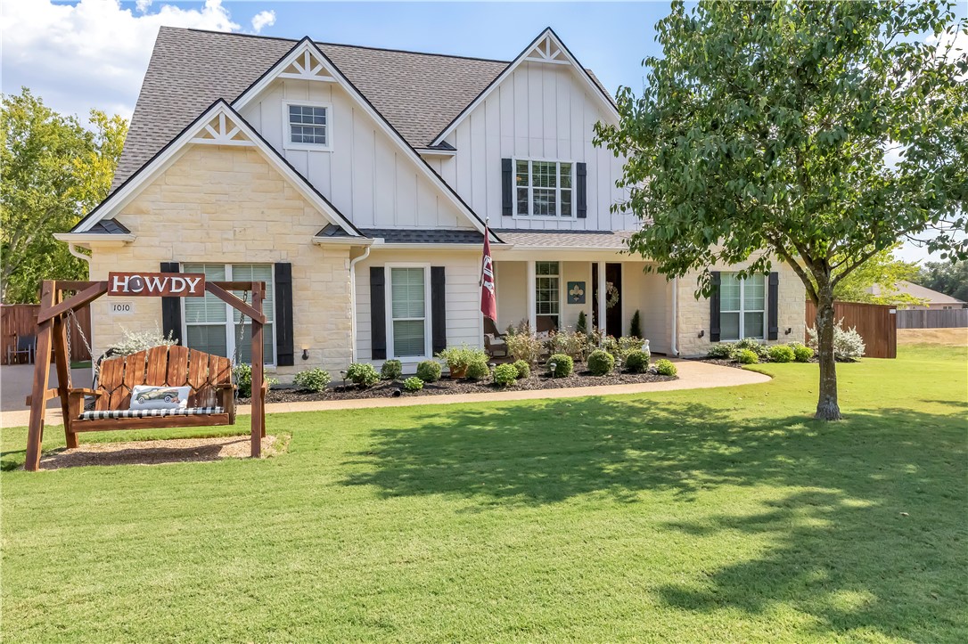Welcome to luxury living in the heart of Aggieland—just 2 miles from Texas A&M! Tucked inside a prestigious gated community, this stunning residence sits on an oversized lot and combines elegance, comfort, and convenience in one perfect package. With 4 bedrooms, 3.5 baths, formal dining, a cheerful breakfast area, and a designer kitchen filled with custom touches, every detail of this home has been crafted to impress. The soaring vaulted ceilings in the living room frame a cozy fireplace and provide breathtaking views of the backyard retreat, creating a space that feels both grand and inviting.