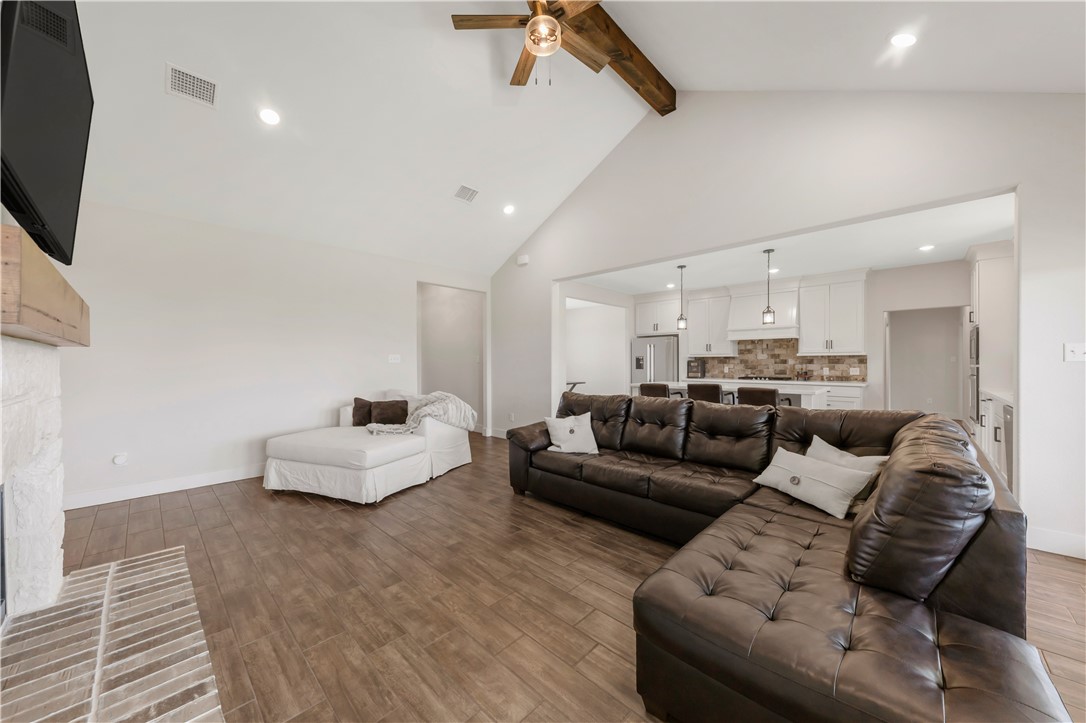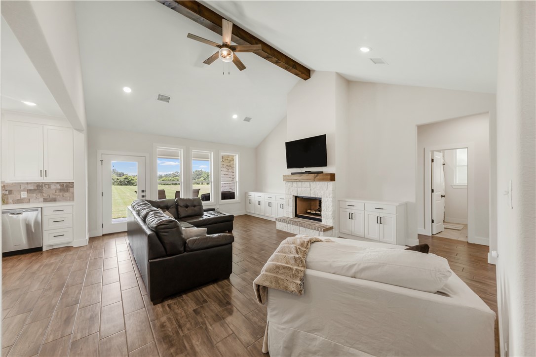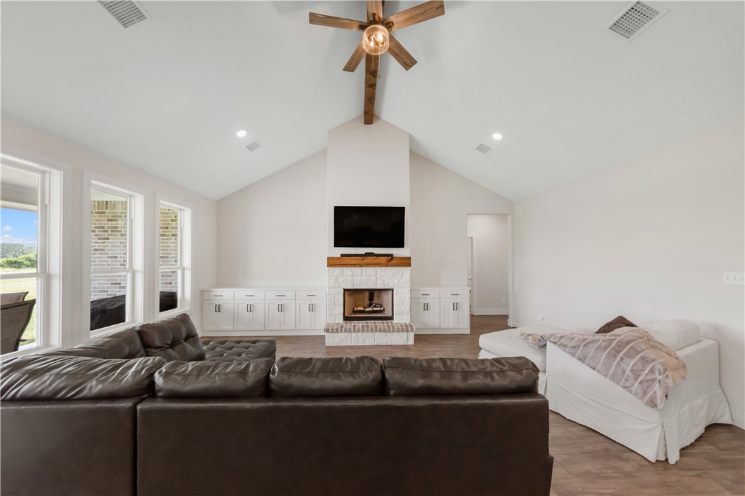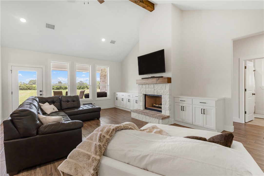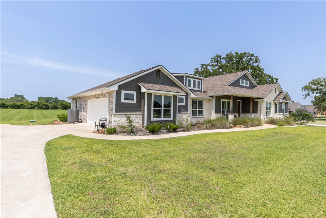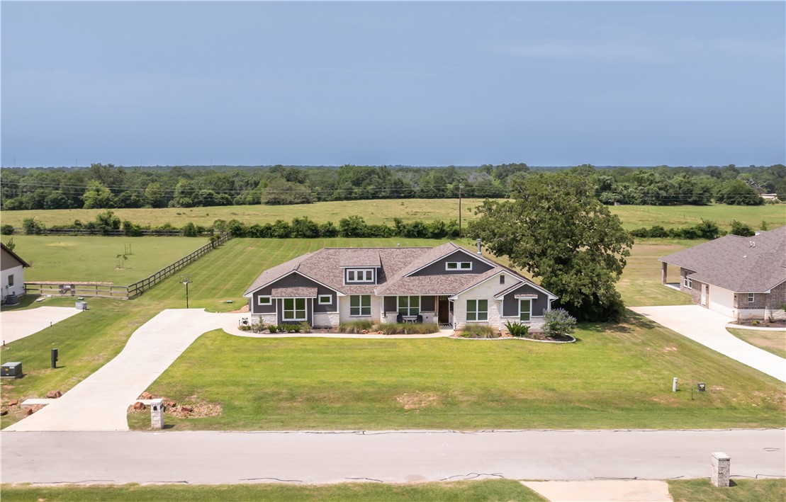 Welcome to this nearly new, beautifully maintained home located in the desirable King Oaks community. Nestled on a 1+ ac lot, this 4-bd, 3.5-bath residence offers the perfect blend of functionality, comfort, and elegance with an exceptional 3-way split floor plan designed for privacy and entertainment. The heart of the home features an open-concept kitchen and living area, complete with a cozy fireplace flanked by cabinetry. The island kitchen boasts quartz countertops, a gas range, and a sink overlooking the backyard, ideal for both everyday living and hosting. A huge walk-in pantry provides ample space for appliances and food storage. Just off the kitchen, you’ll find a formal dining area that easily accommodates large gatherings. Throughout the home, enjoy the warmth and durability of wood-look tile flooring, with plush carpet in the bedrooms for added comfort. The primary suite offers a retreat with a private entrance to the back patio, dual sinks, a separate soaking tub and shower, and a generously sized walk-in closet. Two guest bedrooms share a bathroom, while the fourth bedroom features an ensuite bath, perfect for guests seeking extra privacy. An additional study overlooking the front yard is ideal for working from home or as a quiet reading space. Located 15 minutes from College Station, King Oaks offers a serene, upscale lifestyle with exceptional community amenities, including a community pool, 60-ac nature preserve with walking trails, & a pond with a gazebo.