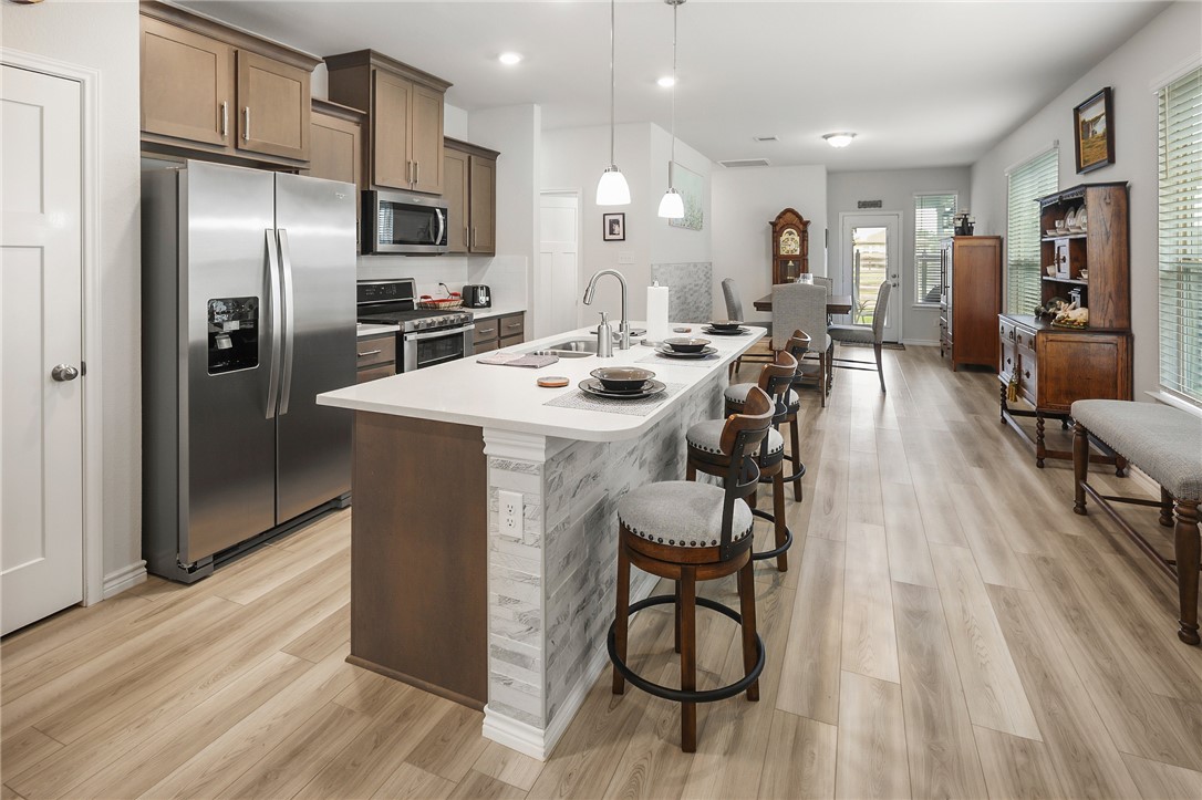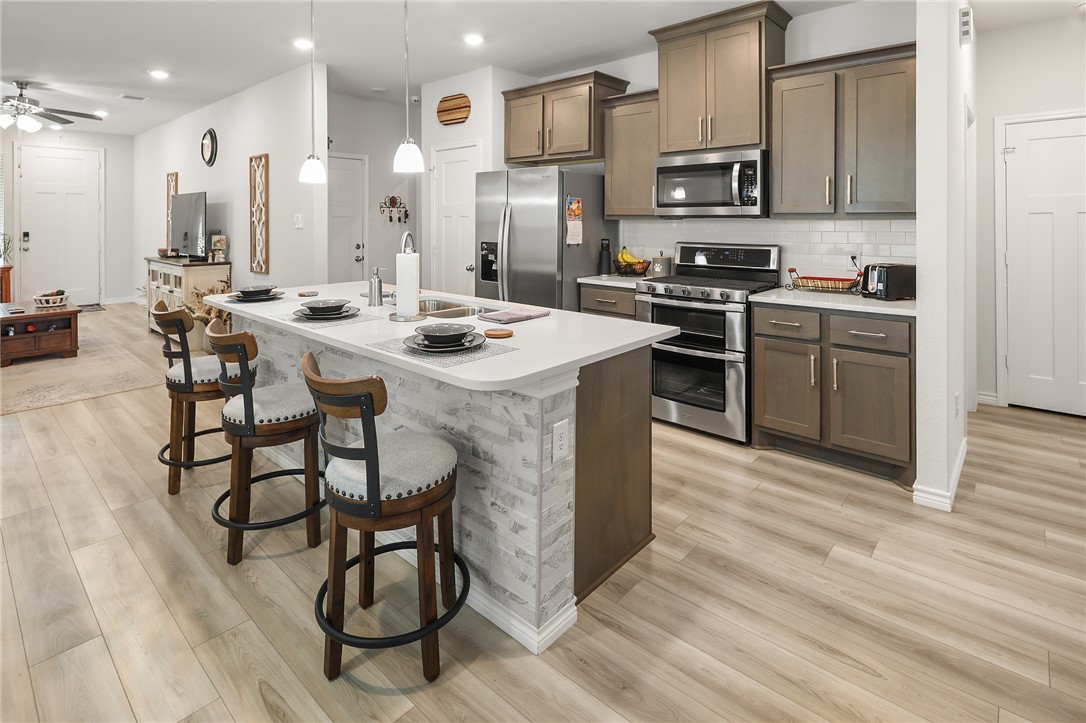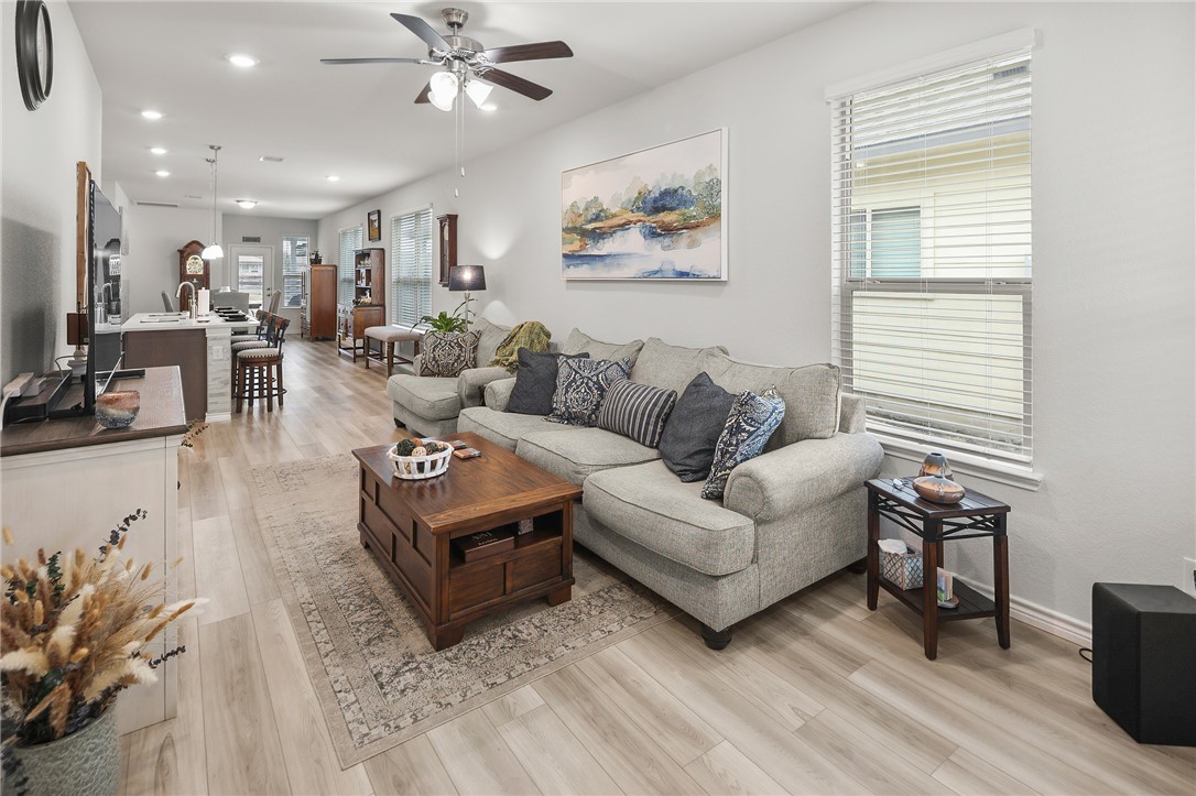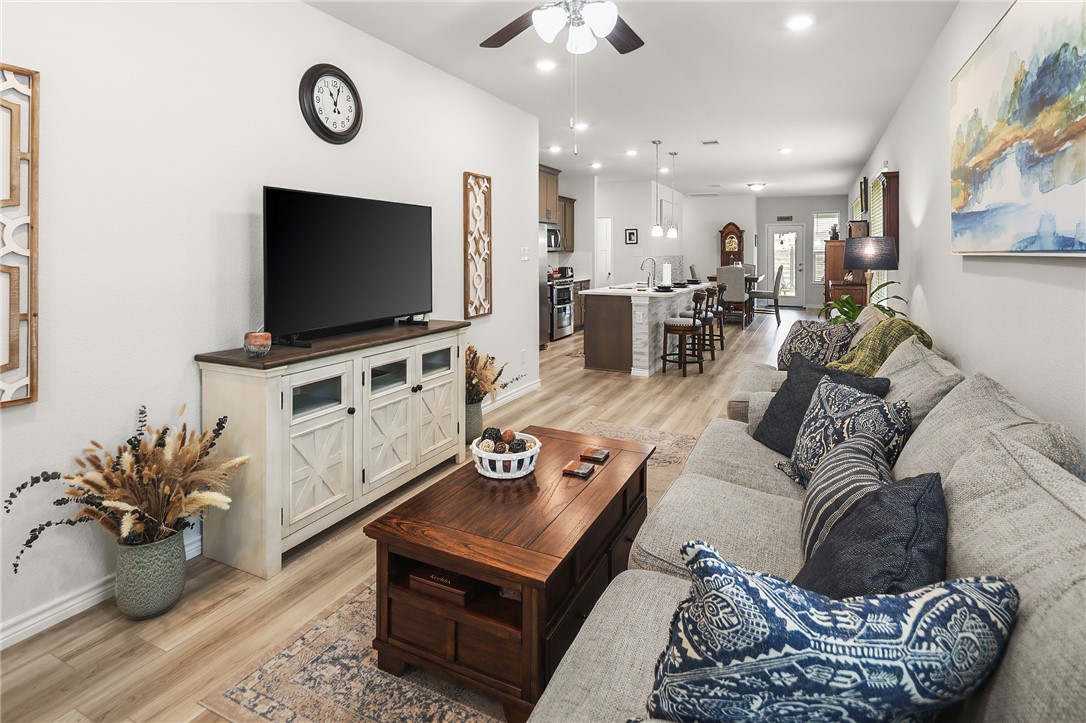 Better than new! This meticulously maintained home is centrally located in desirable College Station Midtown Reserve. It features 1,531 square feet arranged in an efficient 3 bedroom, 2 bathroom plan. This floorplan centers around the open concept kitchen with an island that provides dining on one side and living on the other, affording either three distinct spaces, or one large flowing space great for entertaining. The kitchen is ideal for everyday cooking or feeding a crowd with quartz countertops, a gas range with an integrated double oven feature, and a stylish tile upgrade on the island (no more fidgety feet scuffing the paint!). A matching tile accent wall in the dining area adds a distinctive touch of design continuity. Each bedroom, along with the living room, is equipped with ceiling fans for added comfort and energy efficiency. The primary suite offers a comfortable retreat with ample space. The primary bathroom features dual sinks and a large walk-in shower. Enjoy peaceful outdoor living with no backyard neighbors. Additional highlights include: Registered HVAC equipment parts warranty through 2031, ADT alarm system equipment included (a $1,500 value). Discover the convenience of Midtown Reserve located moments from Scott and White Hospital, shopping, and restaurants. Welcome Home!