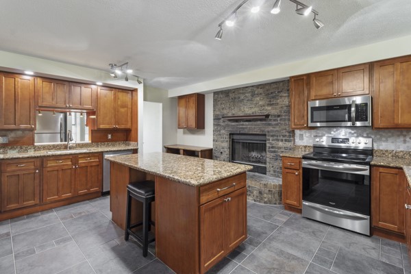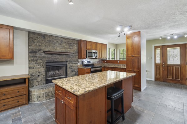 The remodeled kitchen is a cook’s dream — featuring granite countertops, an abundance of cabinets, a large island, and a walk-in pantry with bonus storage. Plus, enjoy a butler’s area for an additional prep space and an extra fridge for entertaining.