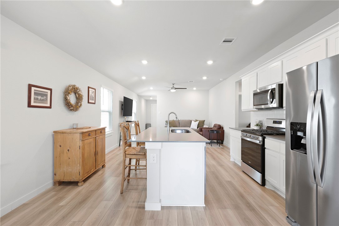 Discover the perfect mix of comfort, convenience, and modern convenience at 1110 Amistad Loop in College Station’s Midtown Reserve. This well-designed 3-bedroom, 2-bath home offers an open-concept layout that flows naturally from the living area into a spacious kitchen equipped with quartz countertops, stainless steel appliances, and a large island for easy entertaining. The home comes equipped with many smart-home features, including a smart thermostat, video doorbell, and keyless entry—bringing added security and energy efficiency to your everyday living. The private primary suite includes a dual-sink vanity and walk-in closet, while the two secondary bedrooms share a well-appointed second bath. Step outside to a fully fenced backyard and covered patio—ideal for relaxing or outdoor dining.