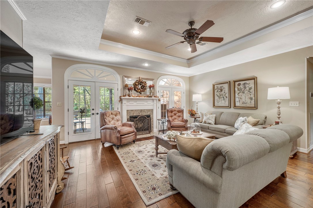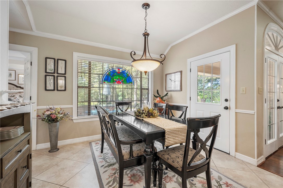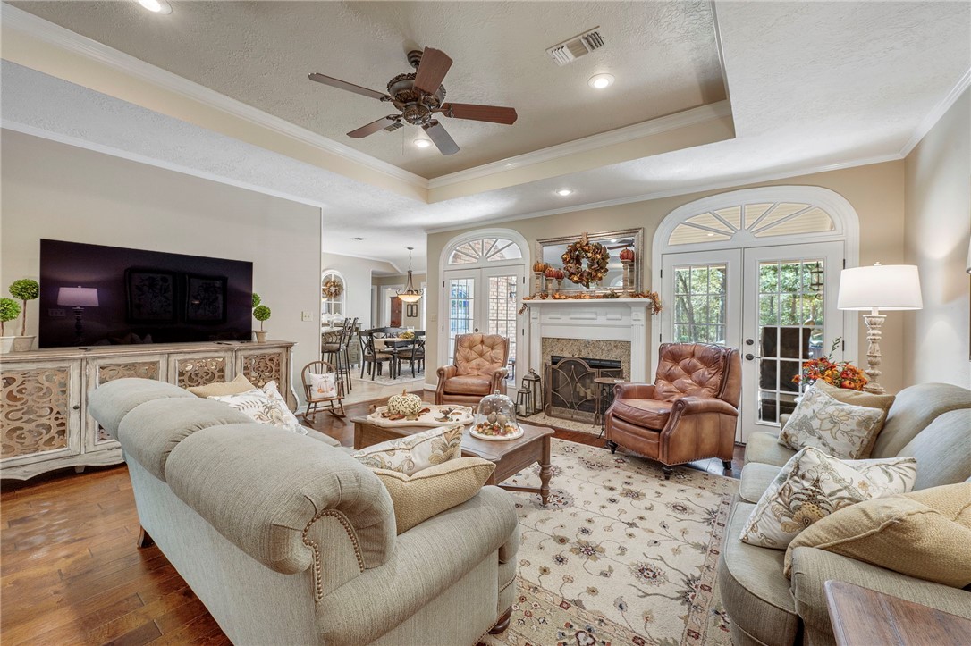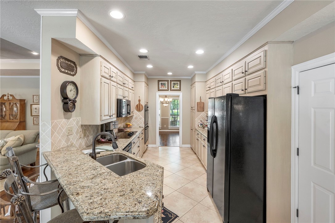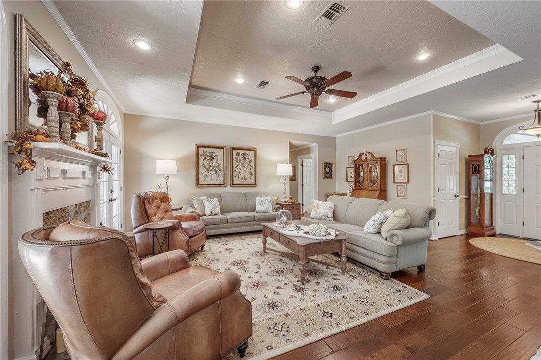 Enjoy pop-up ceilings in the living room and bedrooms, crown molding throughout, custom transoms, and a fireplace with a hand-crafted surround and mantel. The kitchen includes double ovens, separate cooktop, new built-in microwave, and refrigerator. A dedicated laundry room adds functionality and convenience. The custom patio, designed by a local landscape architect, features brick accents and a separate grilling area—perfect for entertaining. The oversized attached garage is paired with a brick-lined driveway and sidewalk, plus additional parking space.