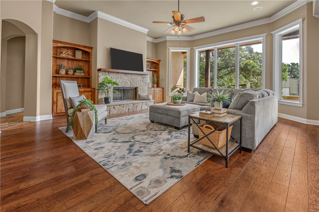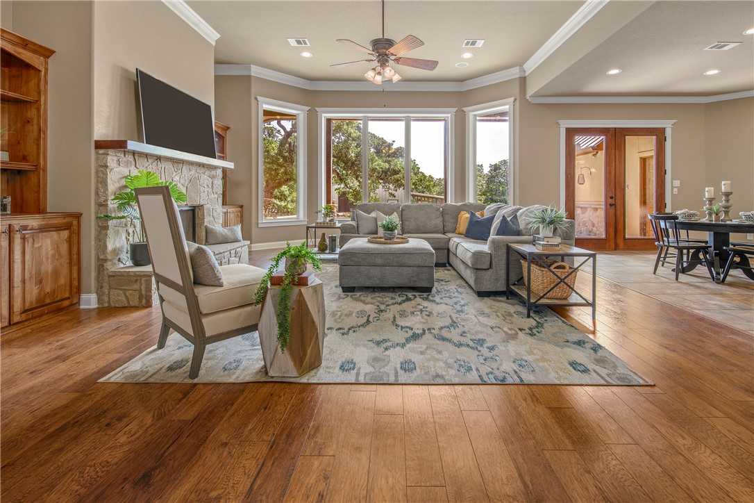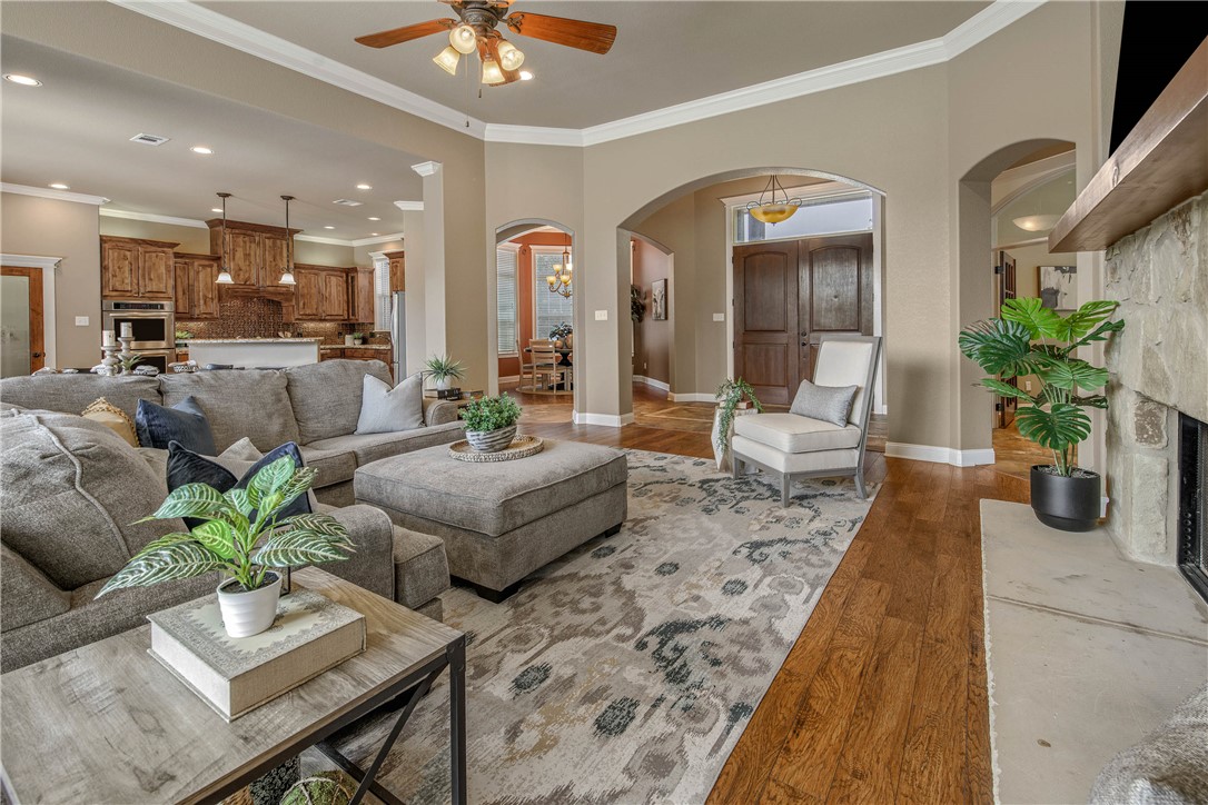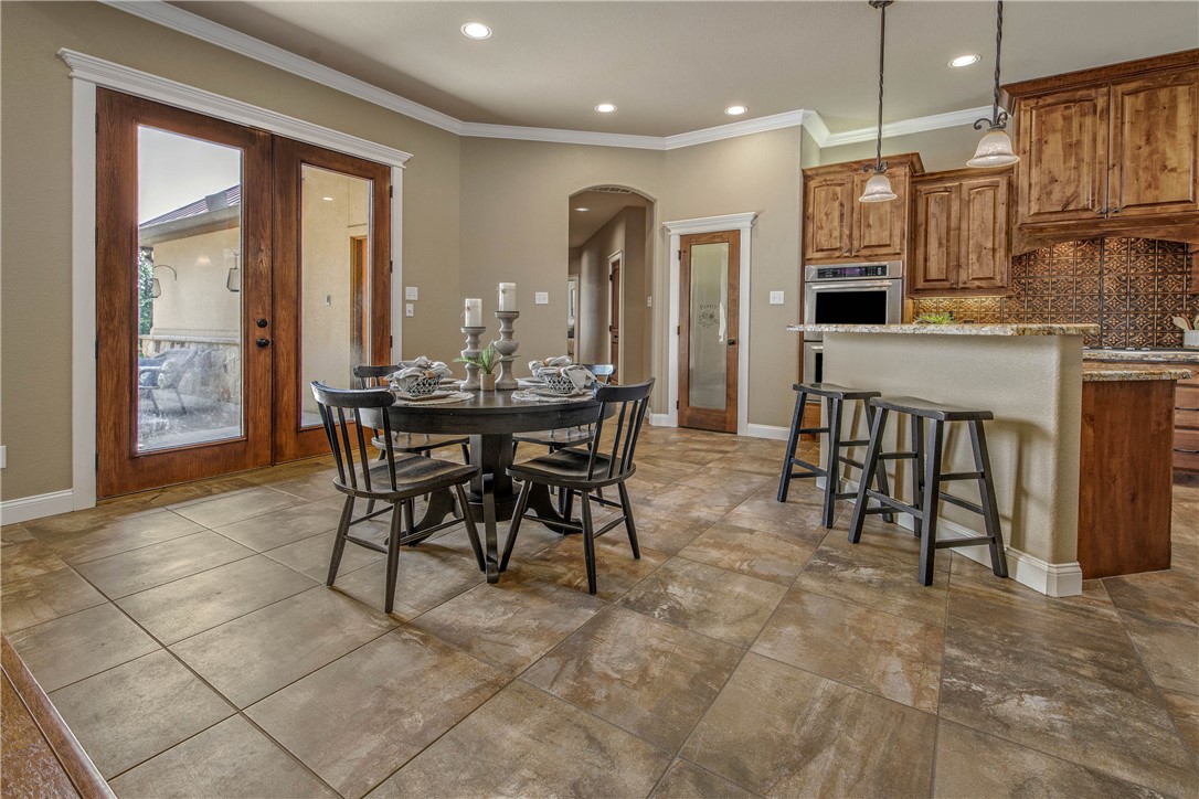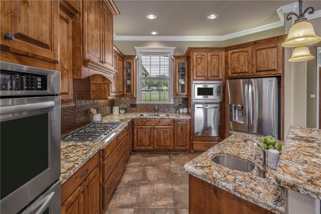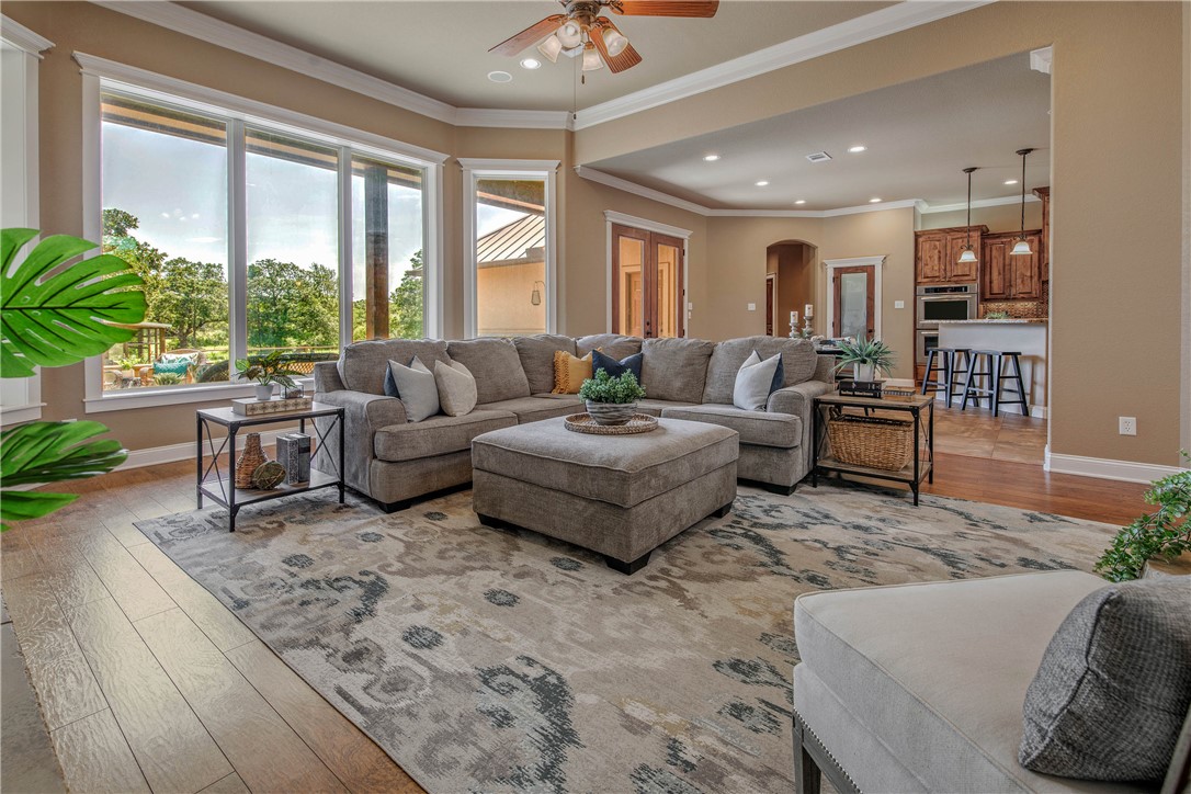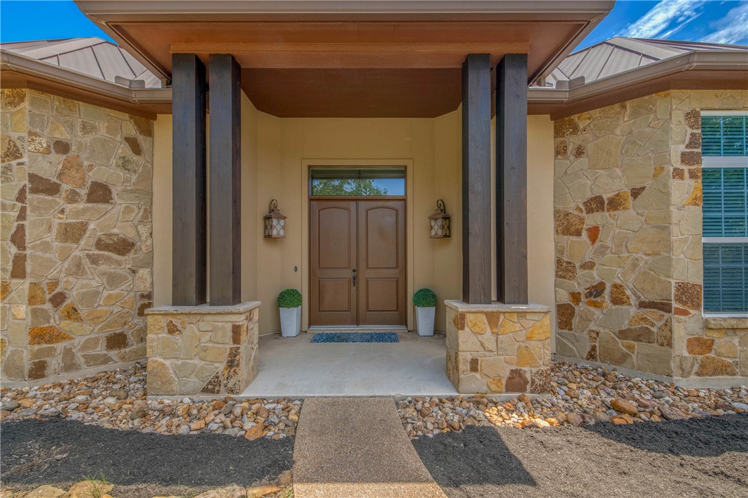Tucked away on 3.45 acres of peaceful countryside, this rustic retreat offers the charm of country living with the convenience of being just minutes from Jones Crossing’s shops, dining, and H-E-B and only 8 minutes to Texas A&M. As you step through the front door, you're welcomed by rich custom cabinetry, crown molding, and recessed lighting that flow throughout the home, setting a warm and refined tone. The living room invites you in with large windows that fill the space with natural light, custom built-ins, and a cozy fireplace. The formal dining room and private office are framed by elegant bay windows ideal for gatherings or quiet productivity. The kitchen is designed for ease and function, featuring a double oven, dishwasher, and an prep sink built into the island. Each bedroom offers unique touches: one with double closets, another with a built-in writing desk or make-up vanity and a generous walk-in closet, connected by a Jack-and-Jill bath. The serene primary suite includes tray ceilings, two oversized walk-in closets, dual vanities, a soaking tub, and a walk-in shower with dual shower heads. Step outside to enjoy a spacious back patio overlooking the open acreage, ideal for entertaining. The property also includes a large outdoor workshop for equipment and storage, a convenient half bath with patio access, and an oversized laundry room with utility sink. This home blends rustic elegance with thoughtful design—country comfort close to it all.