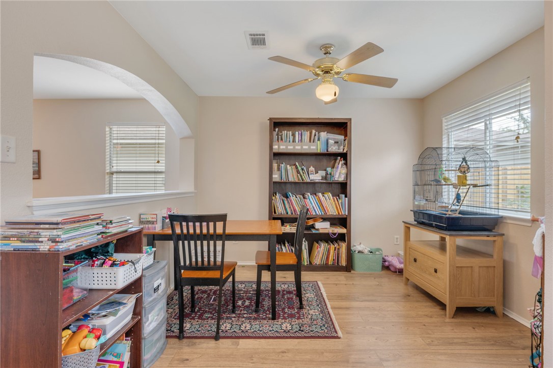 Upstairs, the flex room can be whatever you need: a home office, playroom, workout space, gaming zone, guest nook, craft room — the options are endless. The large fenced backyard backs up to open acreage, giving you privacy and wide-open sky views. Neighbors love living here for the friendly vibe and the community pool and playground just a short walk away. You’re close to shopping, restaurants, and Texas A&M, yet it still feels calm and country-quiet at the end of the day.