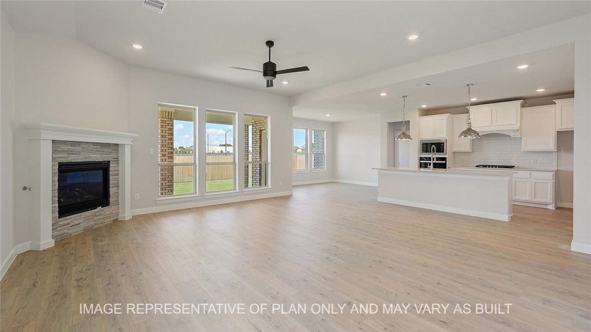 Welcome to the Hampton floorplan. This two-story, 5 bedroom, 3.5 bathroom home features approximately 3,620 square feet of living space. The large foyer greets you as you step off the porch and into the home. Here, you’ll find bedrooms 2 and 3, both complete with windows, carpeted flooring, and spacious walk-in closets. These two secondary bedrooms share access to a jack and jill style bathroom with private sinks and a shared shower/tub area, plus linen shelving. Moving past the entry, you’ll notice the staircase that resides near the study space. Also in this part of the home is a coat closet and powder bathroom, along with the utility/mud room which has garage access. On the opposite side of the first floor is the open-concept dining and living room that opens into the kitchen and breakfast nook. The kitchen boasts custom maple cabinetry, a large quartz island, walk-in pantry, and stainless-steel appliances. The first floor is complete with the primary bedroom situated off the kitchen. This large bedroom has a connected primary bathroom with extra storage, separate tub and shower, dual quartz vanity, as well as a large walk-in closet. Moving up to the second floor, you’re met at the top of the stairs with the loft and secondary bedroom 4. Past the loft, you’ll find bathroom 3 situated next to the last secondary bedroom and hall closet. Don’t forget to spend time outside with the large, covered patio and privacy fenced backyard.