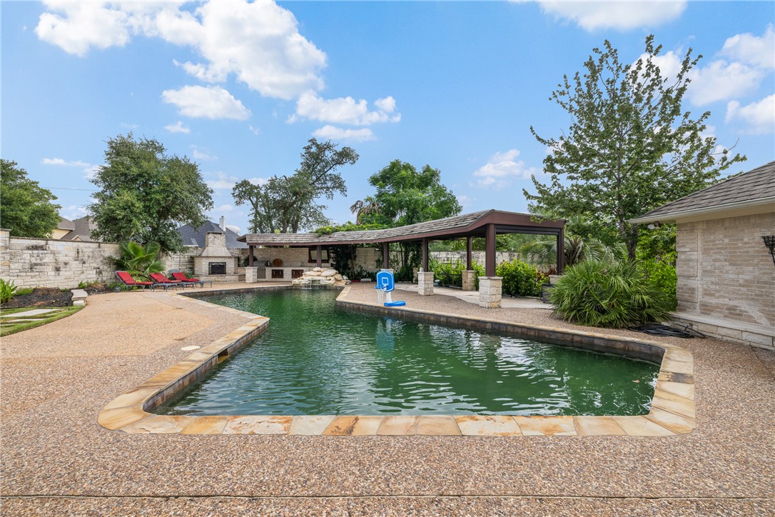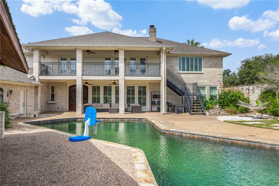 This 6-bed, 4.5-bath luxury residence offers an unparalleled setting for hosting, gathering, and relaxing in style. The home's elegant layout features a grand staircase that invites you in to a large living room with plantation shutters for a perfect view of your backyard dreams come true. Cook up a meal to entertain with a large kitchen with a wine bar and overlooking your private courtyard for morning coffee or an evening cocktail. The home features a master suite with high ceilings, large built ins and two oversized walk in closets. Retreat to your master bath each evening with a hot tub sized bathtub and a smart shower featuring 4 shower heads. The other 5 bedrooms are large enough for office space, gym space or a hobby room. The upstairs living room doors open up to the expansive balcony where you can let in the fresh air while you entertain. Step outside to a true backyard oasis—a beautifully landscaped retreat complete with expansive decks that invite al fresco dining, lounging, and celebration under the stars. The luxury pool with waterfall are ready for an evening swim for all of your friends. Inside, you'll find a stunning blend of classic architecture and high-end modern updates, including updated paint, new LED lighting throughout, updated tankless water heater, sprinkler system, updated plumbing, Three HVAC units, updated showers, doors, and windows. Unique touches like a built-in bar, hidden cabinetry, and laundry chutes add character and charm.