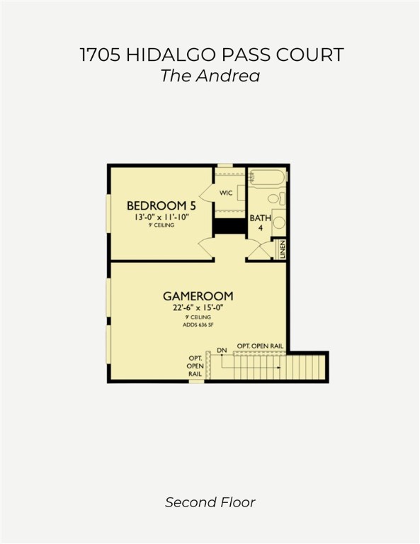 This home includes five bedrooms, each with their own walk-in closet. The second bedroom, located adjacent to the standard 3rd car garage, features a full bath, and semi-private entrance through the utility room – useful for multigenerational living. The Andrea also includes a study and a large flex room that can be customized into a home theater, gym, or any additional space needed. Upstairs, you’ll find the fifth bedroom fourth bath, with an expansive game room for the entire family’s enjoyment.