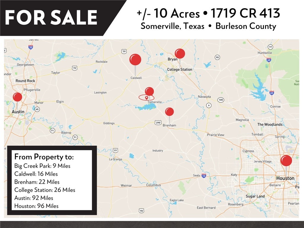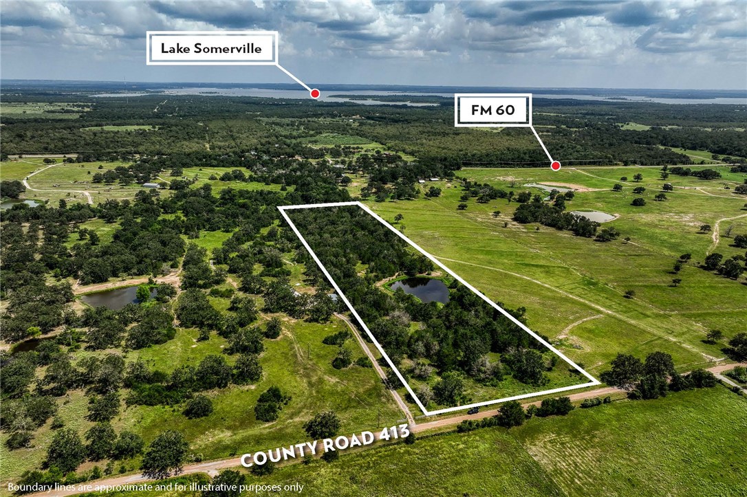 Welcome to your own little slice of Heaven! Whether you're looking for a full-time residence or weekend escape close to the lake, this property has so much to offer. 10+/- beautiful acres available just minutes from the recreational opportunities of Lake Somerville. This property features wooded areas, a gorgeous, large pond and lovely scattered mature hardwoods. Agricultural valuation is in place to assist with keeping taxes low and property is accessed by hardtop road frontage on County Road 413. A variety of birds including dove, roadrunners are often viewed on-site, and white-tailed deer are often observed as well. Bring your imagination and shape this property into your dream.