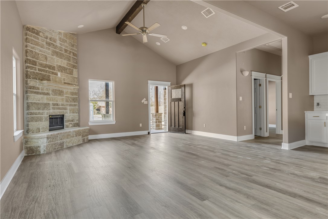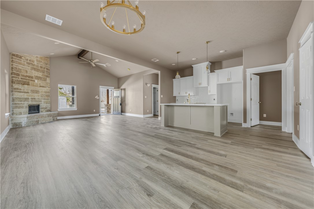 Step inside to find new construction with laminate flooring throughout, adding a sleek, cohesive look to your living space. The living area boasts a striking cathedral ceiling and a captivating stone fireplace, perfect for creating warm memories. The kitchen is a chef’s delight, featuring stainless steel appliances, quartz countertops, and an upgraded backsplash that complements the contemporary design.