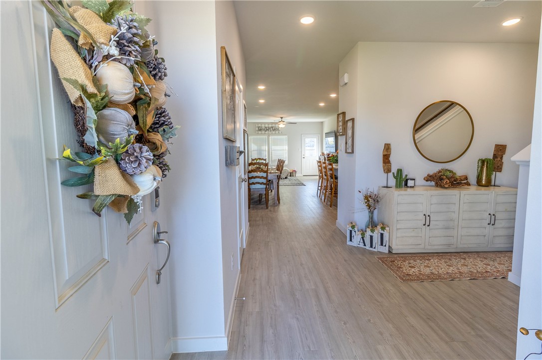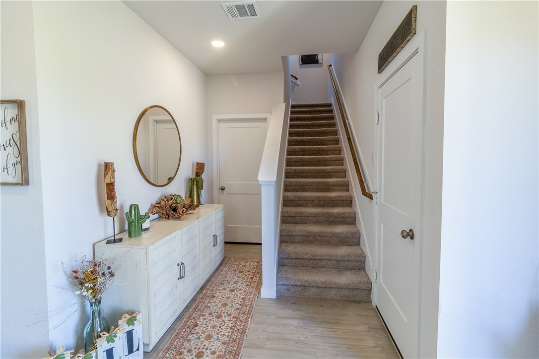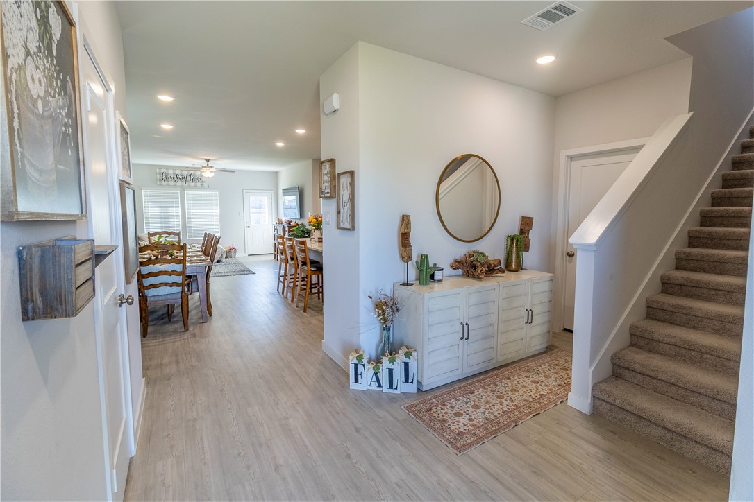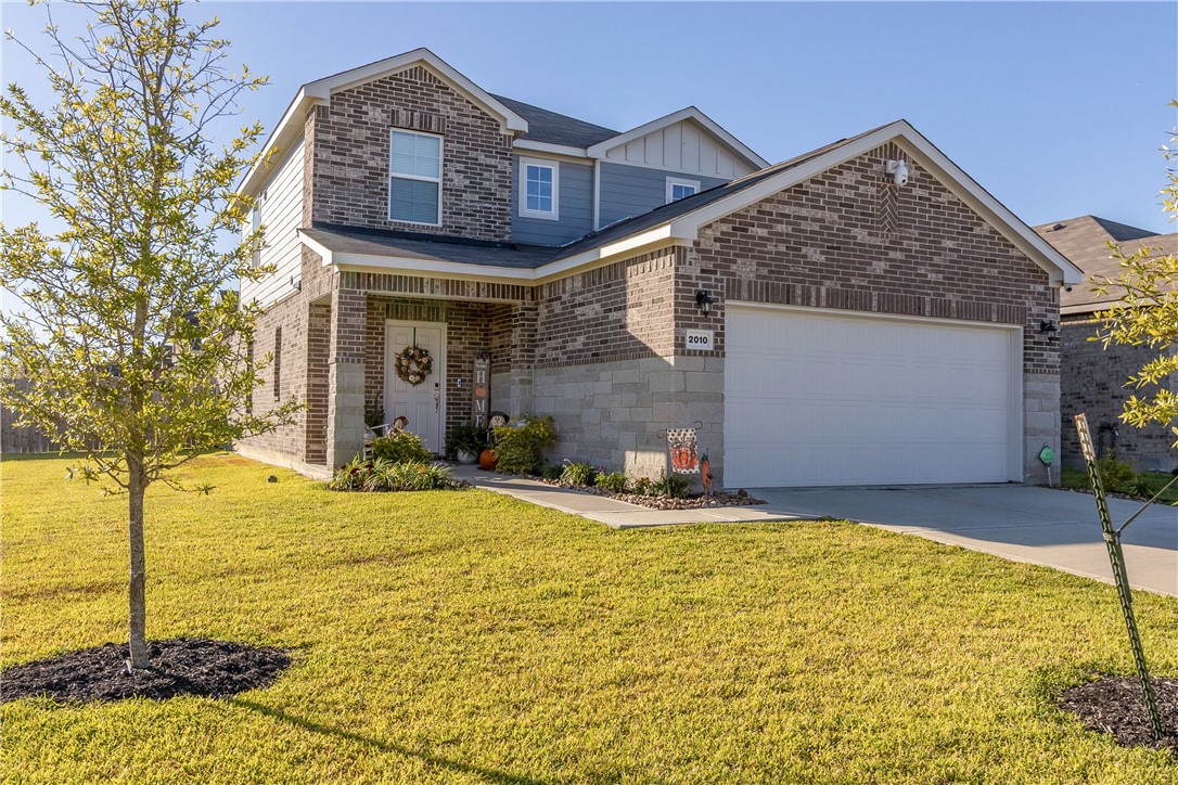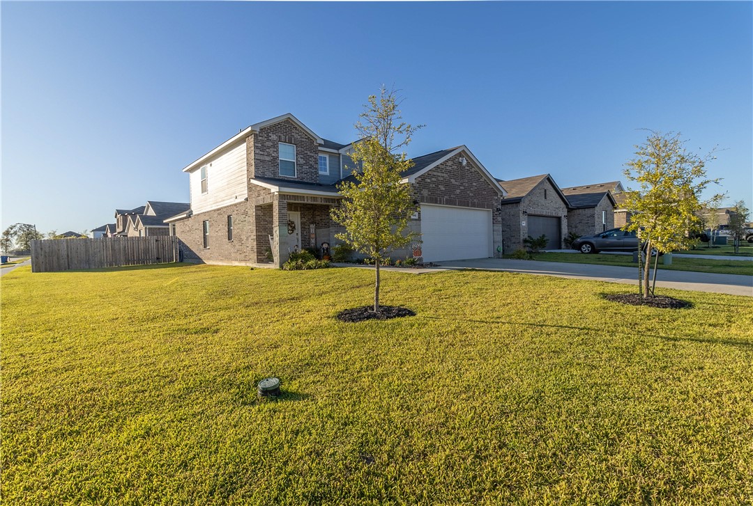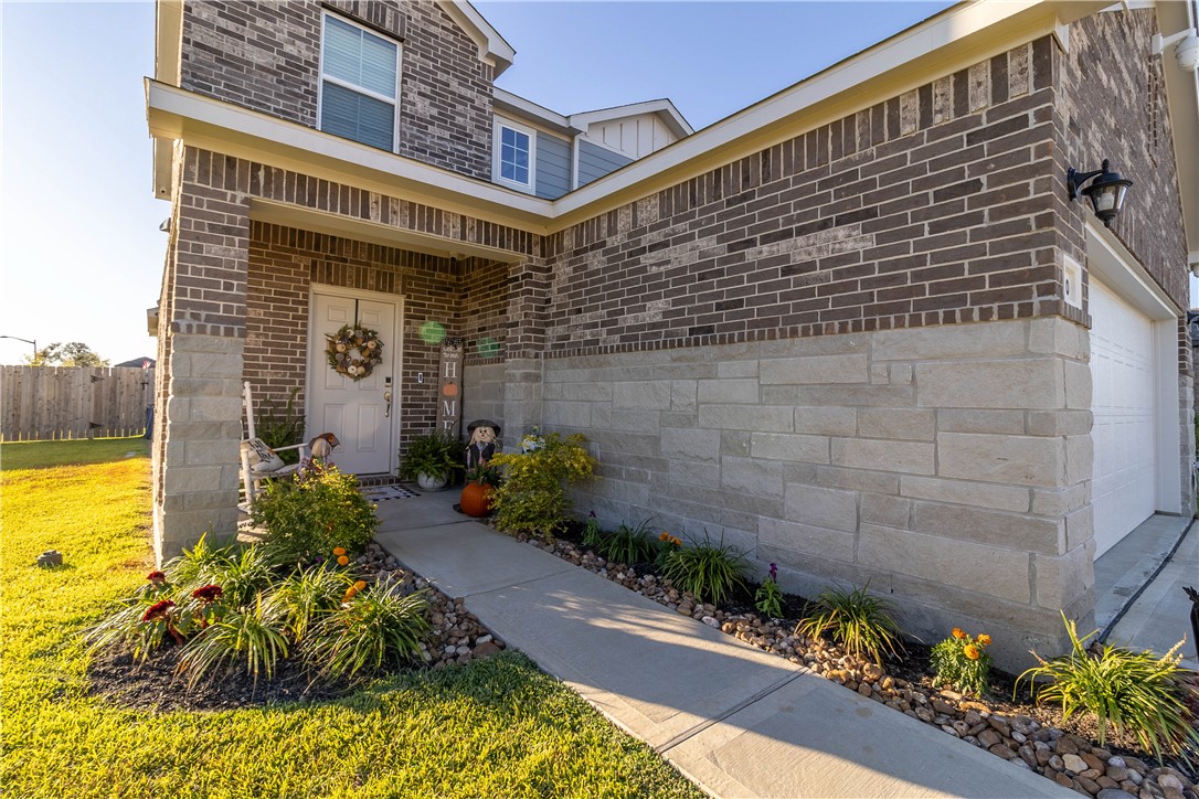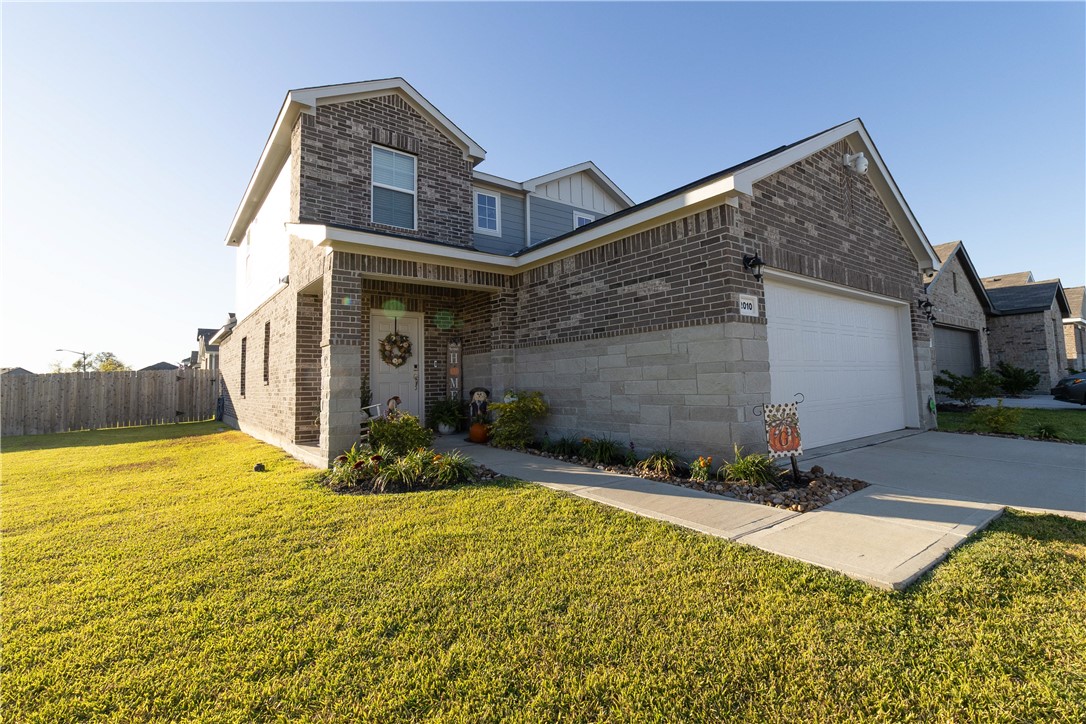 Welcome to your home in Pecan Lakes Subdivision. This 4-bedroom, 2.5-bath residence, built by Century Communities, showcases the elegant Hampton Plan and boasts 2,005 sq. ft. of living space. Step inside to discover an open-concept design featuring a kitchen equipped with granite countertops, gas stove/range, Whirlpool appliances and an inviting island—perfect for entertaining. The primary suite is conveniently located on the main floor, offering a serene retreat with a full bathroom featuring a walk-in closet, granite vanity sinks, and an enclosed glass shower, while three additional bedrooms and bathroom upstairs provide ample space for family or guests. Enjoy the extra versatility of a bonus room, ideal for a home office or playroom located atop the stairs on the second floor. This home has raised ceilings and upgrades including stylish faucet fixtures, cabinetry handles, ceiling fans and lighting in the kitchen. Situated on a corner lot within a golf course community, this property combines style, comfort, and convenience. Located close to downtown Navasota and all of its amenities, and just a quick drive to College Station / A&M.