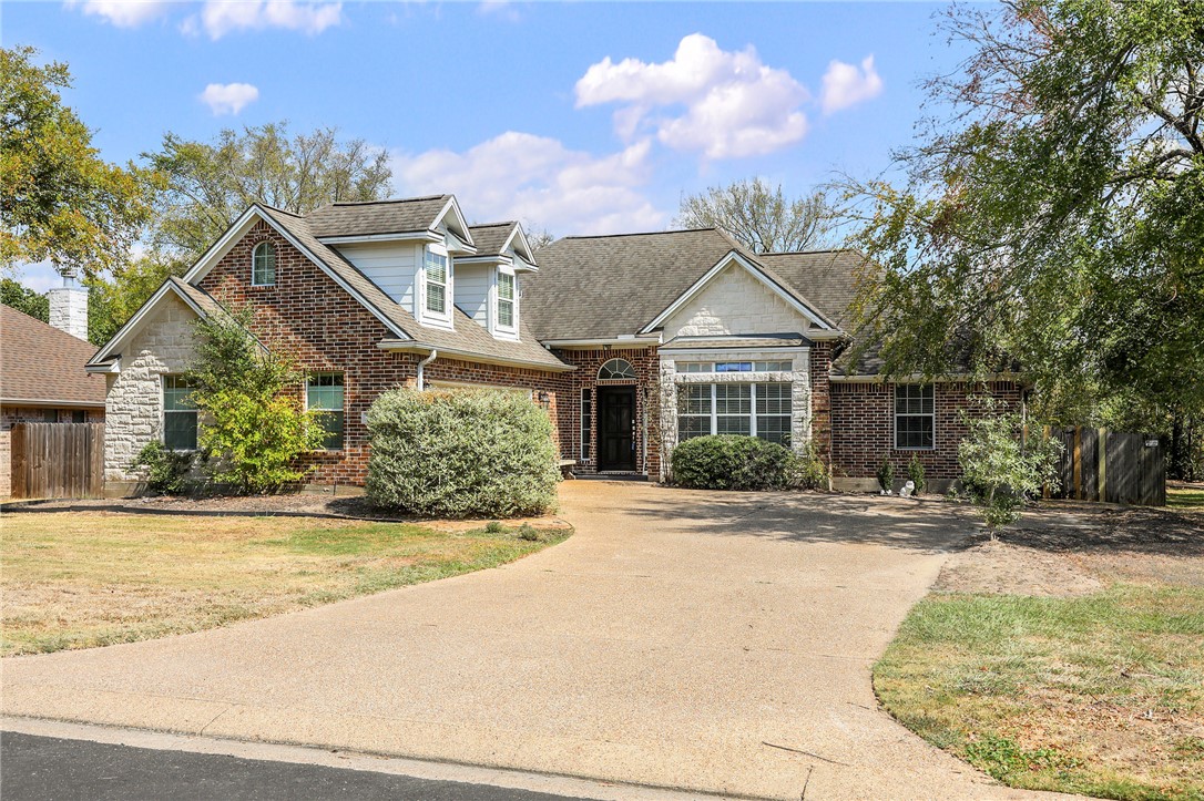 You can’t get any closer to Forest Ridge Elementary than this! This private two-story Castlegate home sits directly behind the school and beside the greenbelt leading directly to campus, making morning drop-offs a breeze! Inside, a welcoming living room greets you with 15-foot ceilings, hardwood floors, and a cozy gas fireplace. The kitchen features granite counters, white cabinets, a stainless gas range, and plenty of storage, along with an eating bar and breakfast nook overlooking the pool. A desirable split bedroom floor plan places the spacious primary suite on the main level, complete with a bonus sitting area or office, dual vanities, soaking tub, shower, and large walk-in closet. Two secondary bedrooms share a full bath with dual vanities, while an upstairs flex room easily serves as a fourth bedroom, game room, or playroom. The backyard is an entertainer’s paradise—surrounded by mature trees and backing to a greenbelt—with a covered patio, large pool, and extra side yard. A side-entry garage and extended driveway provide ample parking. Stainless French-door Samsung refrigerator, washer, and dryer convey. New carpet in primary bedroom, dining room, and hallway! Just one mile to H-E-B, restaurants, and shopping at Tower Point, and zoned for College Station High School, this home offers it all - convenience, comfort, and lifestyle! Schedule your showing now before this one gets away!