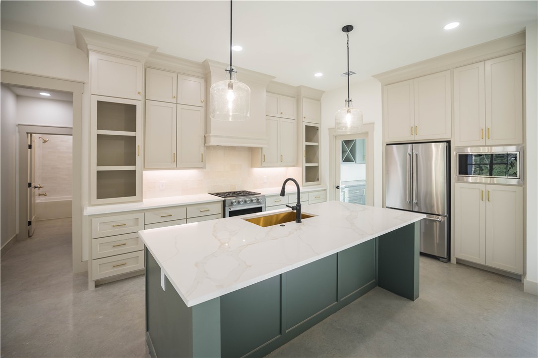 The spacious living room, highlighted by a wood burning fireplace. The large kitchen, which seamlessly connects to the living area, is equipped with ample cabinetry, generous counter space, large island, and stainless steel appliances and the walk-in pantry is a must see. The master bedroom includes a bathroom with a double vanity, separate shower and bathtub, as well as a walk-in closet.