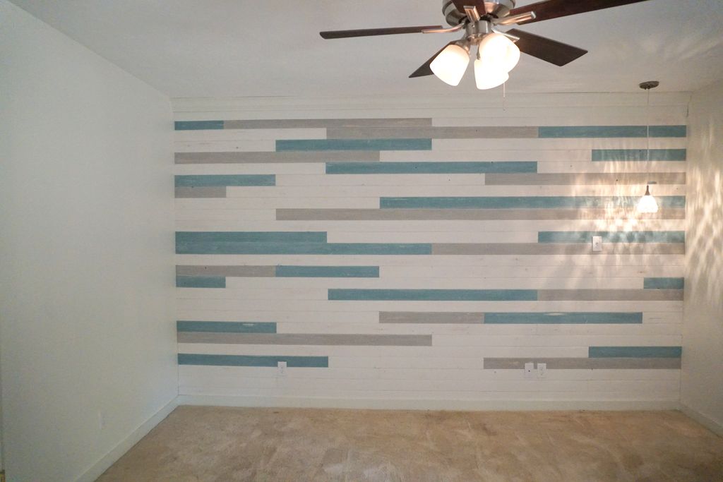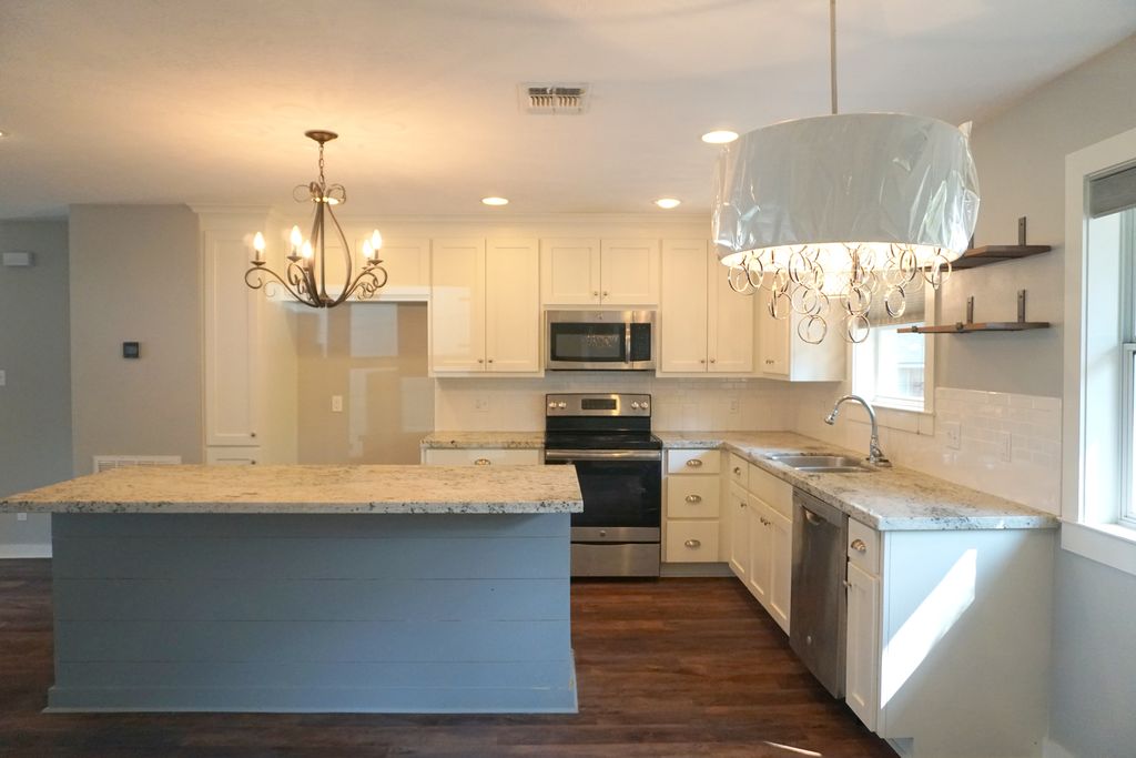 The kitchen features an oversized bar with storage, quartz countertops, and built-in stainless steel appliances. Two bedrooms are situated just off the main living area, including the primary suite, which showcases a shiplap accent wall with a custom pendant light. A sliding barn door leads to the private primary bath, complete with a custom-tiled shower.