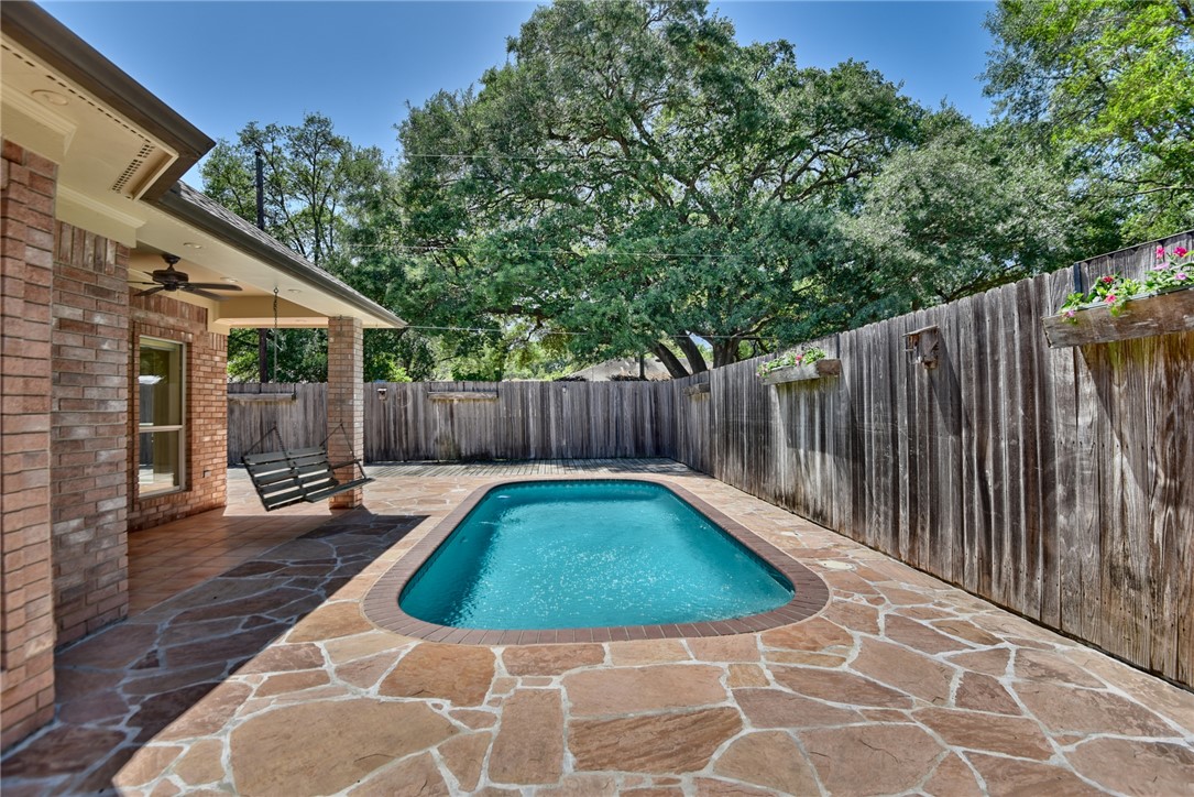 Additional highlights include a built-in Service or Safe room, large laundry room and half bath for guests. The oversized garage includes an additional 10'x12' climate-controlled attic storage room. The backyard is a low-maintenance oasis with heated pool, tile and decked floor, an outdoor shower, and a privacy fence with concrete curbing and pipe bracing.