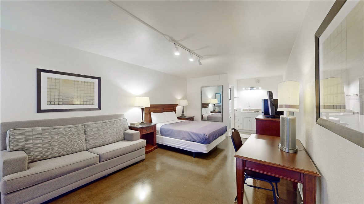 Cosmic Suites offers affordable furnished studio apartments on a weekly or monthly basis. Updated rooms. Huge pool. Flexible terms. Excellent mid century architecture.