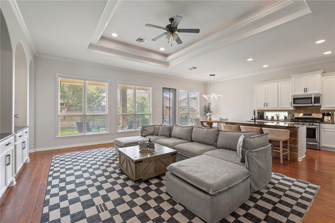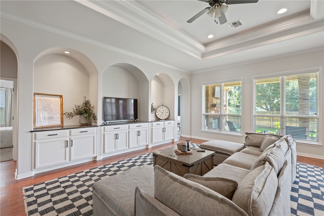 Located in the highly sought-after Castlegate II subdivision this stunning Omega Home with a Walden floor plan offers 2,023 square feet of thoughtfully designed living space. Inside, you’ll find 4 spacious bedrooms and 2 bathrooms, along with built-in cabinetry in both the living area and kitchen, generous walk-in closets, and a large utility room. The living room is enhanced with tiered ceilings and flooded with natural light from three expansive rear windows, creating a bright and open feel. The updated kitchen showcases painted cabinetry, a gas range, stainless steel appliances, and a large working island— essential for everyday living and entertaining. The primary retreat, privately tucked away at the back of the home, offers peaceful views of the yard. Its en-suite bath features dual sinks, a spacious walk-in shower with dual showerheads, a separate soaking tub, and a walk-in closet. Step outside to the outdoor living area, complete with a stone-faced fireplace. Residents of Castlegate II enjoy outstanding amenities, including a resort-style pool, multiple parks, walking trails, greenbelts, and a stocked lake with fountains. The home is also zoned for highly regarded College Station schools.