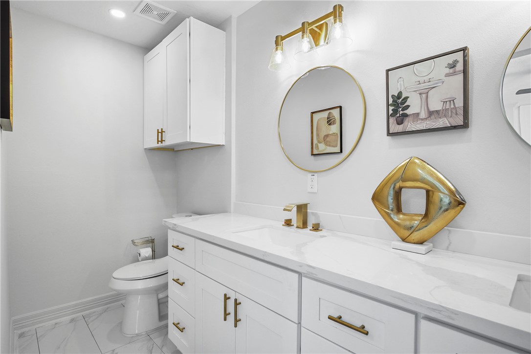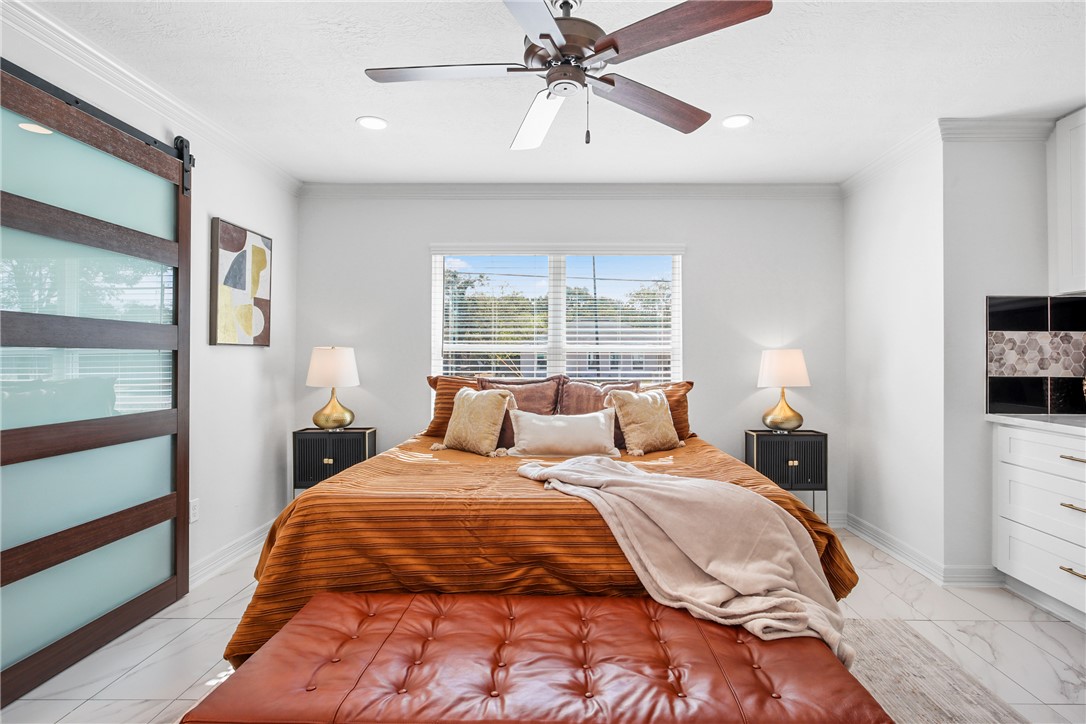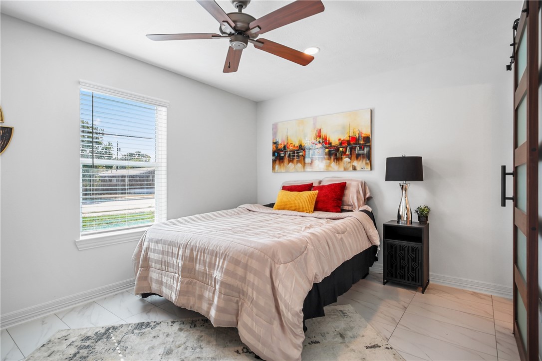 This gorgeous fully remodeled home features quartz countertops, brushed gold plumbing and light fixtures, and beautiful hardware throughout the kitchen and bathrooms. With designer tile flooring throughout the home, this home features four bedrooms and three bathrooms, including two primary suites. A cook's dream with all the counter space and stainless appliances, the kitchen has an abundance of cabinets for storage. At the kitchen sink, there is a window with a view of the backyard. Its barn doors leading to all bathrooms add a touch of style that makes it unique. Located on a corner lot with a large covered patio, a new fully fenced backyard and landscaping in the front and back that are inviting and easy to maintain. New roof, HVAC, sheet-rock, recessed lights, ceiling fans, water heater, windows, doors, exterior paint and hardi-plank, driveway and so much more!!! Come see if this will be your new home today!