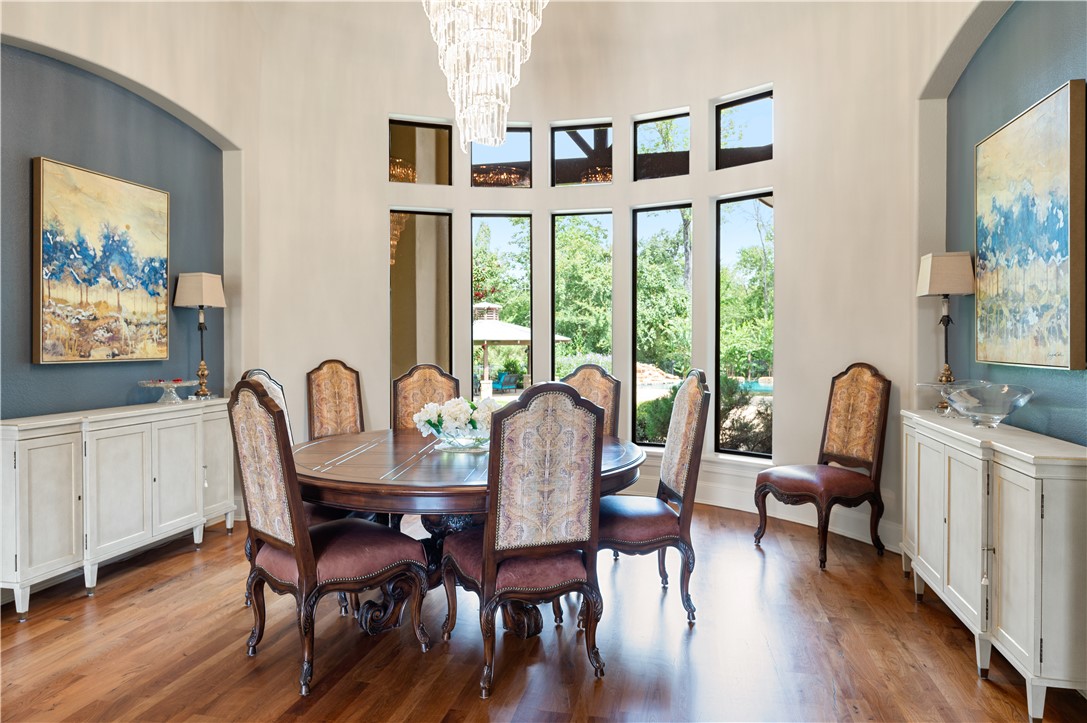 The stately study is flanked with plentiful built ins, and features a cooled, custom 600+ bb wine cellar. The primary suite features sitting area with fireplace, breathtaking spa-like bath with tower ceiling, and larger-than-a-garage bay walkin closet. Four generously proportioned guest suites feature ensuite baths and sizeable closets. Full exercise room with kitchenette steps away could easily convert to inlaws’ quarters.