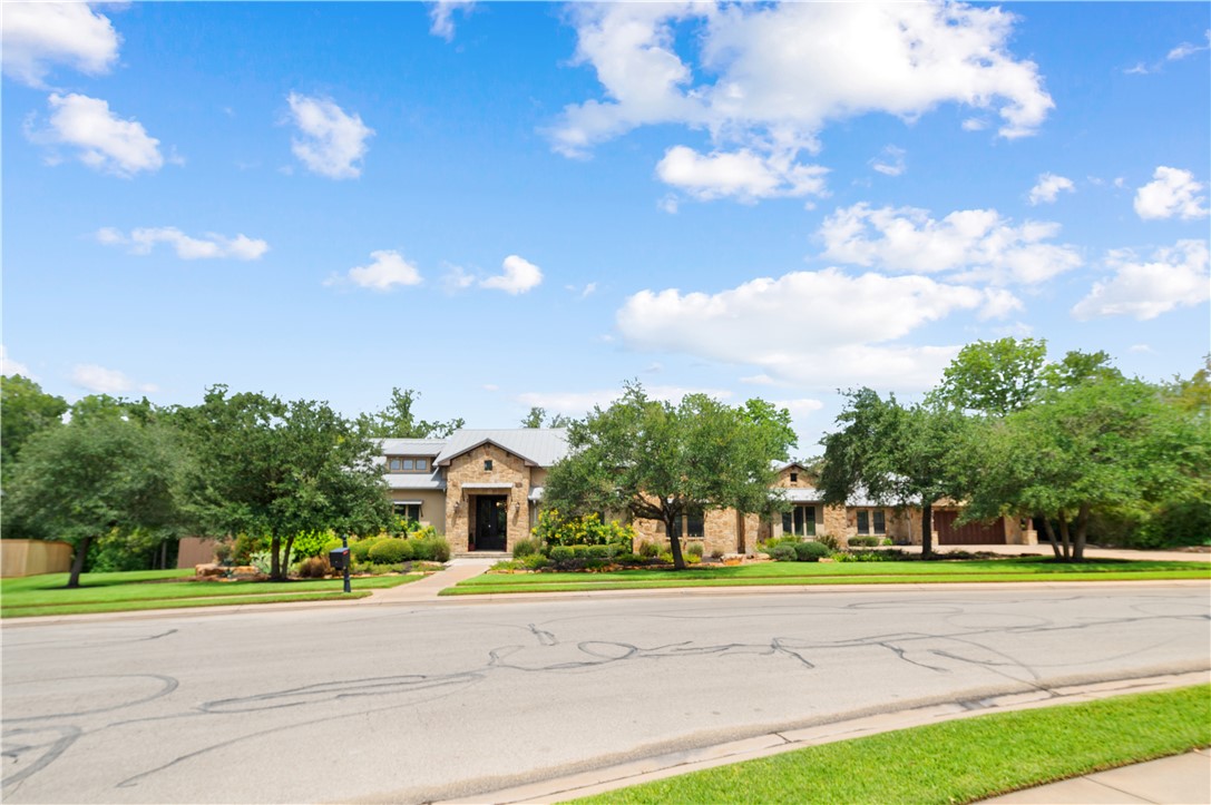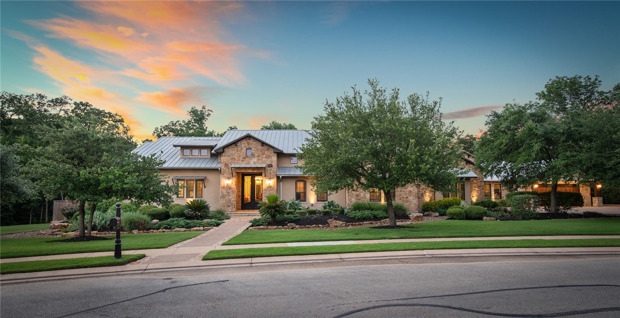 This Traditions ranch estate situated on nearly an acre epitomizes hill country luxury. Discover plenty of room to spread out in 6,500+ square feet of single story comfort. Step through the front foyer in to the formal dining room, which features a wall of windows through which to survey the resort style grounds beyond. All daily living areas feature the warmth and durability of natural mesquite hardwoods and limestone underfoot. Two massive great rooms stand bisected by a natural stone wall and two-sided fireplace. Recently updated, the light, modern kitchen adjoins the larger of the two and features state of the art Kitchenaid appliance suite, custom cabinetry, Tahiti leathered quartzite counters, and a custom built-in butler’s bar.
