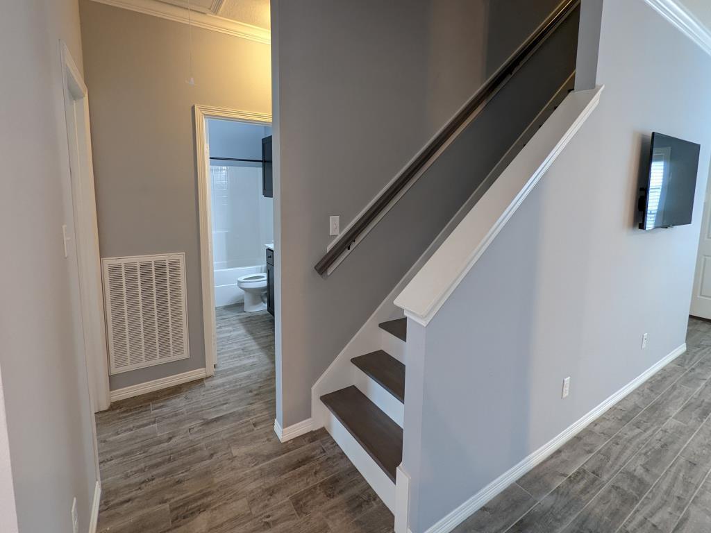 This beautiful 4 bedroom 4 bath Copper Creek townhome was built in 2015 and is conveniently situated along an A&M Bus Route! This townhome is just down the road from Jones Crossing, which provides to your grocery and restaurant needs. The interiors include stainless steel kitchen appliances, cookies & cream granite countertops, espresso shaker-style cabinets, subway tile kitchen backsplash, pendant lighting, grey wood-look flooring in wet and common areas, 50" TV in the living room, Ring door bell, and crown molding. This gated communited also offers a resort-style pool, hot tub, walking trail, clubhouse, and fitness room.