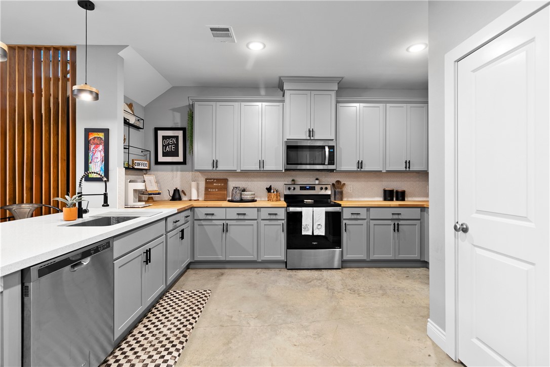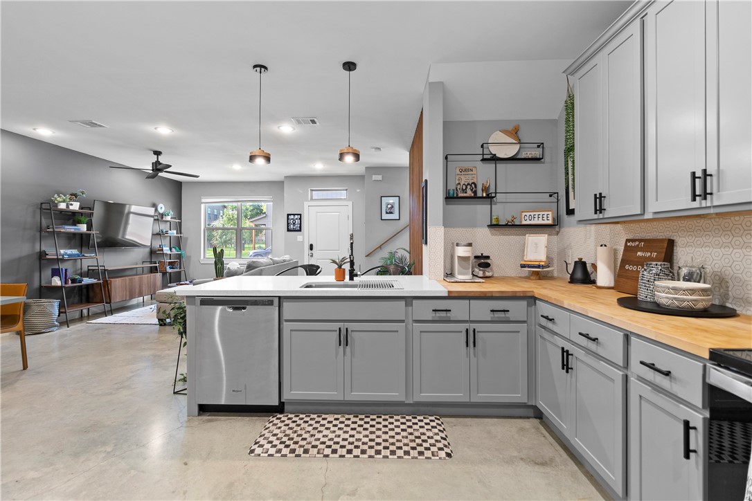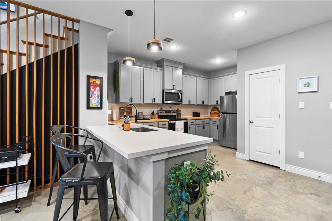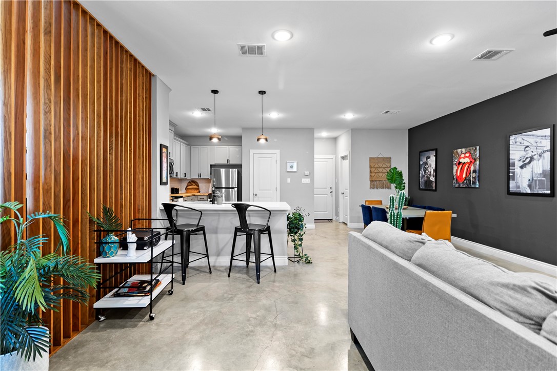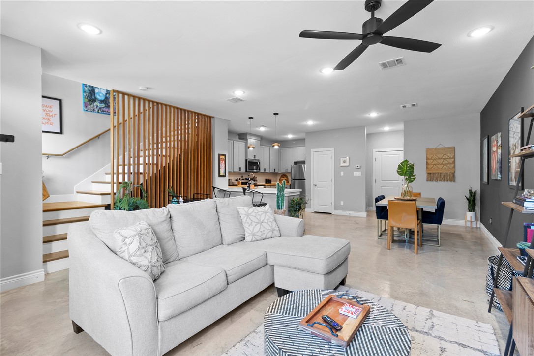 offers an open-concept main floor with stained concrete floors, quartz countertops, and wood accents throughout. Upstairs,