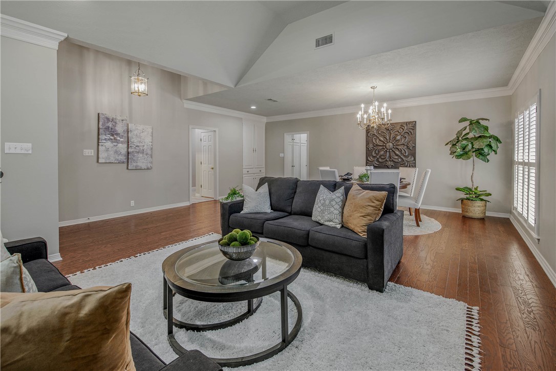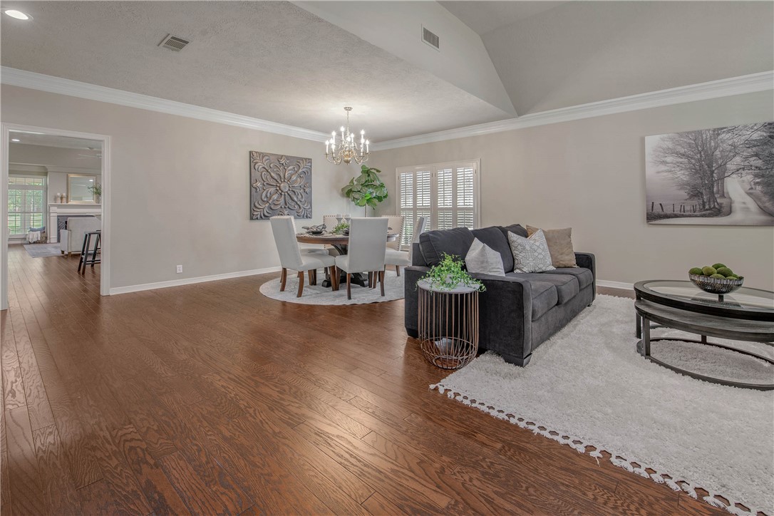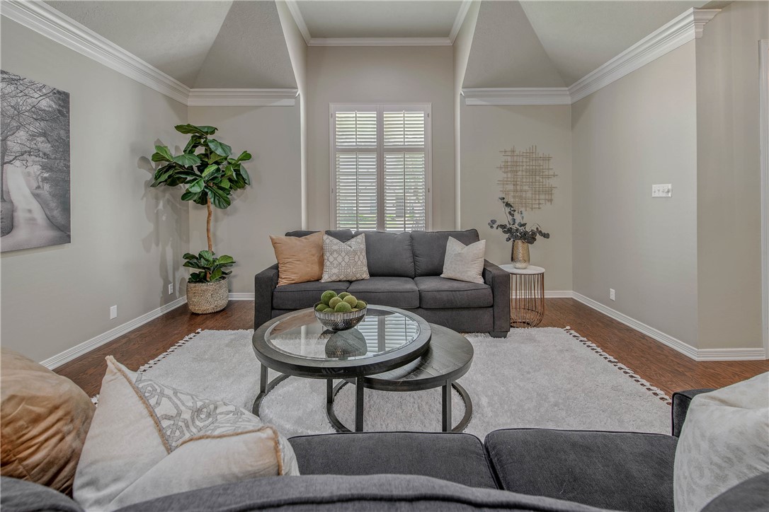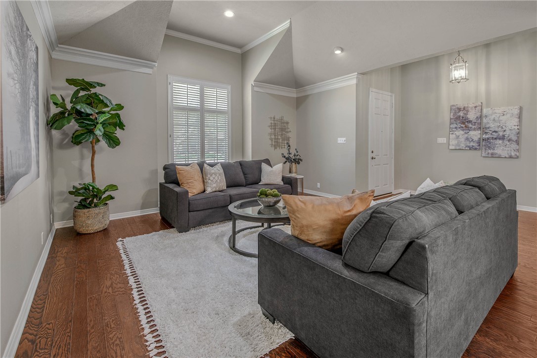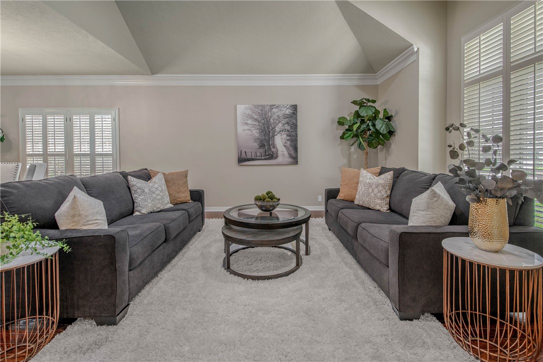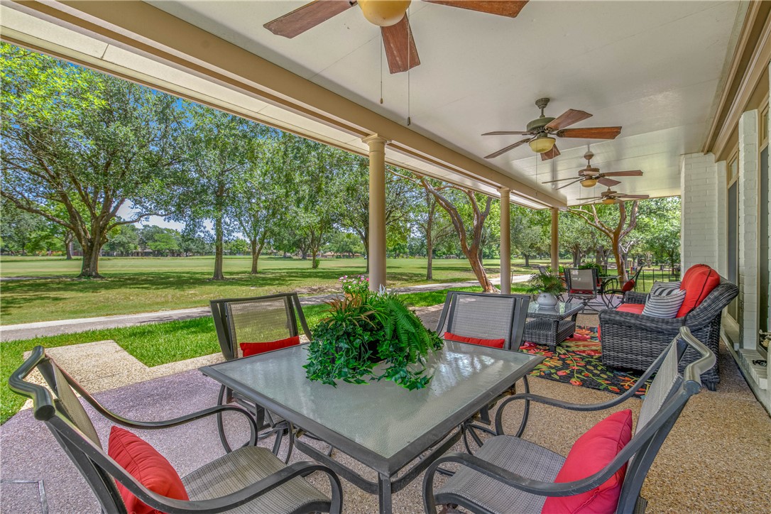 Welcome to effortless elegance and serene golf course living. As you step inside this charming and stylish 3-bedroom, 2-bath home, you're immediately welcomed into the formal living and dining rooms by soaring 10-foot ceilings, rich wood floors, recessed lighting, and detailed crown molding that set a tone of timeless sophistication. A wall of windows floods the open-concept living room, kitchen and breakfast room dining with natural light, offering picturesque views of the 15th fairway, tranquil lake, and fountain beyond. The spacious family room centers around a luxurious fireplace and custom built-in entertainment center—ideal for cozy evenings or casual gatherings. A small, fenced side garden opens to an expansive covered patio with ceiling fans, ideal for relaxing or entertaining year-round. The kitchen is both functional and welcoming, with abundant cabinetry, a bay window breakfast nook, and a built-in writing desk. Retreat to the serene primary suite, with plantation shutters and golf course views. The spa-inspired bath includes oversized mirrors, separate vanities, a large walk-in shower, and two large closets. Storage abounds with multiple hall closets, custom cabinetry, a dedicated firearm closet with in-ground safe, cedar closet, and more. Located just five minutes from dining, shopping, and medical services, this immaculate home offers style, comfort, and the ultimate in golf course living.
