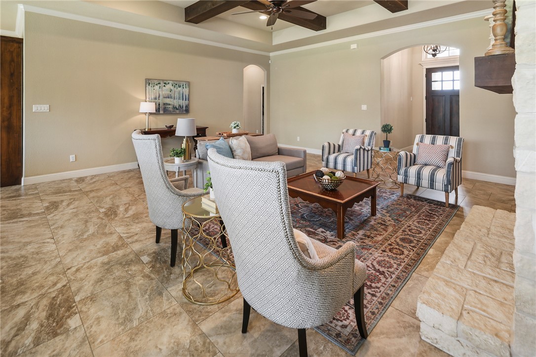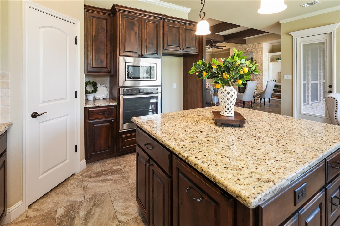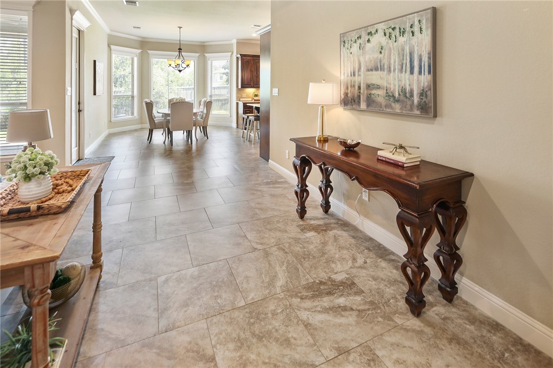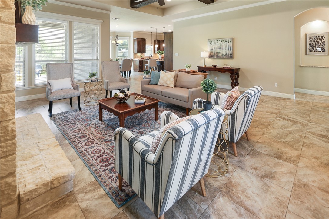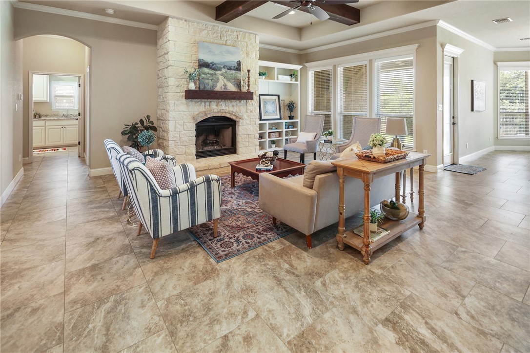 Discover refined living in this beautifully designed 4-bedroom, 3.5-bath home by Pitman Custom Homes, ideally located in the coveted Greenbrier subdivision—just minutes from Texas A&M University and steps from Miramont Country Club. Built in 2016, this one-story residence features a split, open-concept floor plan with elevated finishes throughout. The heart of the home is a chef-inspired kitchen boasting granite countertops, stainless steel appliances, eating bar, large island and an expansive dining area for hosting. The living room impresses with a floor-to-ceiling stone fireplace, cedar-beamed ceilings, and custom built-ins. Retreat to the luxurious primary suite with a jetted tub, oversized shower, and a spacious walk-in closet with built-ins. A dedicated study with French doors offers an impressive work-from-home setup. Enjoy a generous covered patio and an expansive backyard with no rear neighbors—for relaxing or entertaining. Find peaceful streets, elegant homes, and exceptional convenience at 3204 Ashville Path in the Greenbrier subdivision in Bryan!