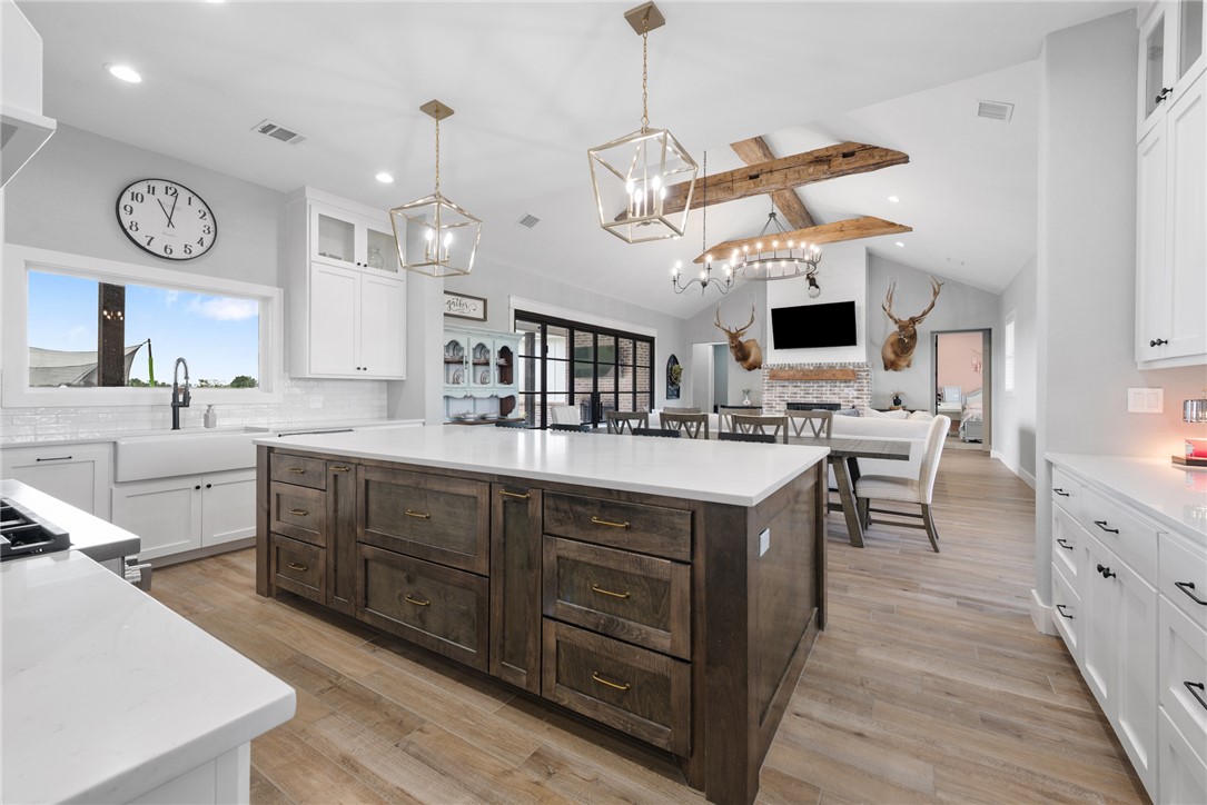 This property blends space, versatility, and functionality with a layout designed for a variety of needs. The main home features 4 bedrooms and 4.5 bathrooms with an open floor plan connecting the living, dining, and kitchen areas. The living room includes a vaulted ceiling with wood beam detail, floor-to-ceiling brick fireplace, and large windows for natural light. The kitchen is equipped with a center island, custom cabinetry, stainless appliances, and a walk-in pantry. The primary suite offers dual vanities, a soaking tub, and a walk-in shower, while each secondary bedroom includes a private en-suite bathroom. A half bath serves guests in the main living area.