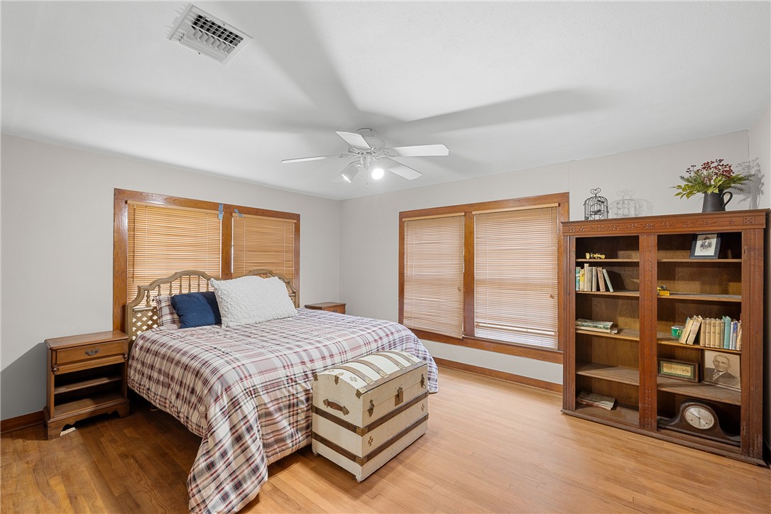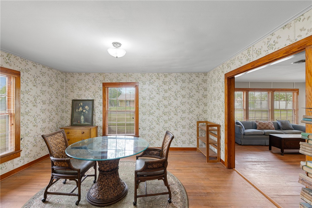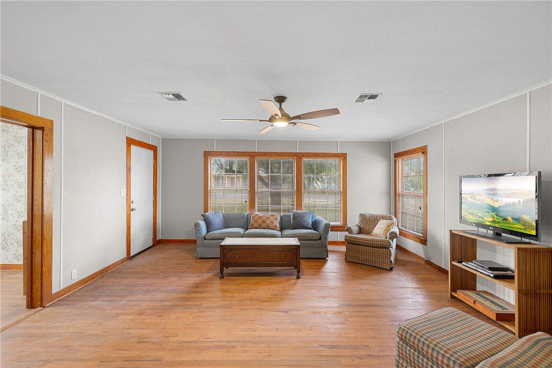 Set on a double lot, this 3-bedroom, 1-bath home delivers small-town living with space to breathe: a wide front yard under mature oaks and a sensible layout inside. The oversized living room anchors the home with original hardwood floors and big windows for natural light. A separate dining room sits between the living area and kitchen—easy for everyday meals or weekend company.
