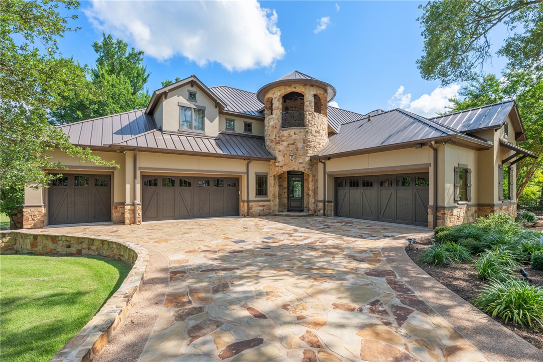 This custom estate sits on a rare 1.4-acre wooded lot backing to the Traditions Golf Course in Bryan. Designed with luxury, privacy, and entertaining in mind, this 7,720.5 sq ft (per CAD) home features 6 bedrooms, 6 baths, 3 half baths and 6 fireplaces, including a stunning pass-through fireplace in the main living area. Enjoy the flexibility of two primary suites, ideal for multi-generational living or hosting guests in style. Dual laundry rooms—one on each level—provide added convenience. Two dedicated offices—one with vaulted ceilings and fireplace, offering an impressive workspace; the second, a more intimate office for quiet study. Soaring curved glass windows surround the dining and bar areas, creating a striking architectural statement. Entertain with ease in the fully equipped bar and wine room, or unwind in the private home theater. A chef’s kitchen features GE Monogram appliances, double ovens, dual dishwashers, warming drawers, and copper sinks. Outdoor living is a showstopper—with putting and chipping greens that bring the golf course to your backyard, alongside a zero-entry pool w grotto, dual spas, custom rock waterfall, and multiple fire pits. The outdoor kitchen, fireplace, and spacious covered patio make this the ultimate backyard retreat. Additional highlights include a 2023 metal roof, central vac system, two upper-level balconies, & luxury finishes throughout. A rare opportunity to own a legacy property in one of Aggieland’s premier communities.