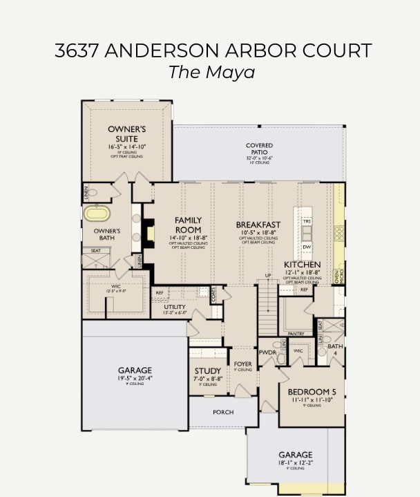 The primary bedroom, conveniently located on the first floor, boasts a large walk-in closet and spacious full bath with dual sinks. Upstairs, you’ll find three additional bedrooms and a central loft space – a great space for a game room or family movie nights. With garage space for three vehicles and walk-in closets provided in each bedroom, it’s no secret as to why The Maya is one of our most sought after plans.