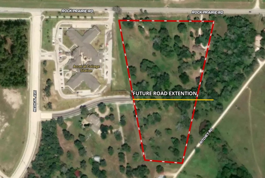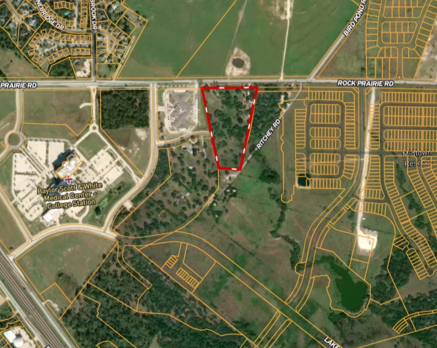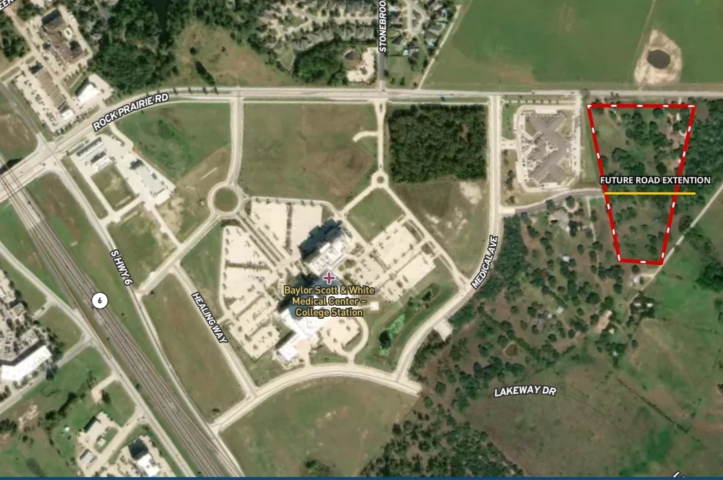 This tract is an ideal location, almost adjacent to the Baylor Scott and White Hospital campus, with Accel Rehabilitation and Midtown City Center on its borders. The frontage on Rock Prairie has recently been widened to a 4-lane boulevard with large sidewalks connecting into the hospital campus. All needed accessory uses are in very close proximity, which include grocery, medical, retail, restaurant, and convenience stores. The property is currently zoned Ag, but we believe the potential entitlements include medical, office, general commercial, or multifamily.(to be negotiated with the city) Utilities are available.
