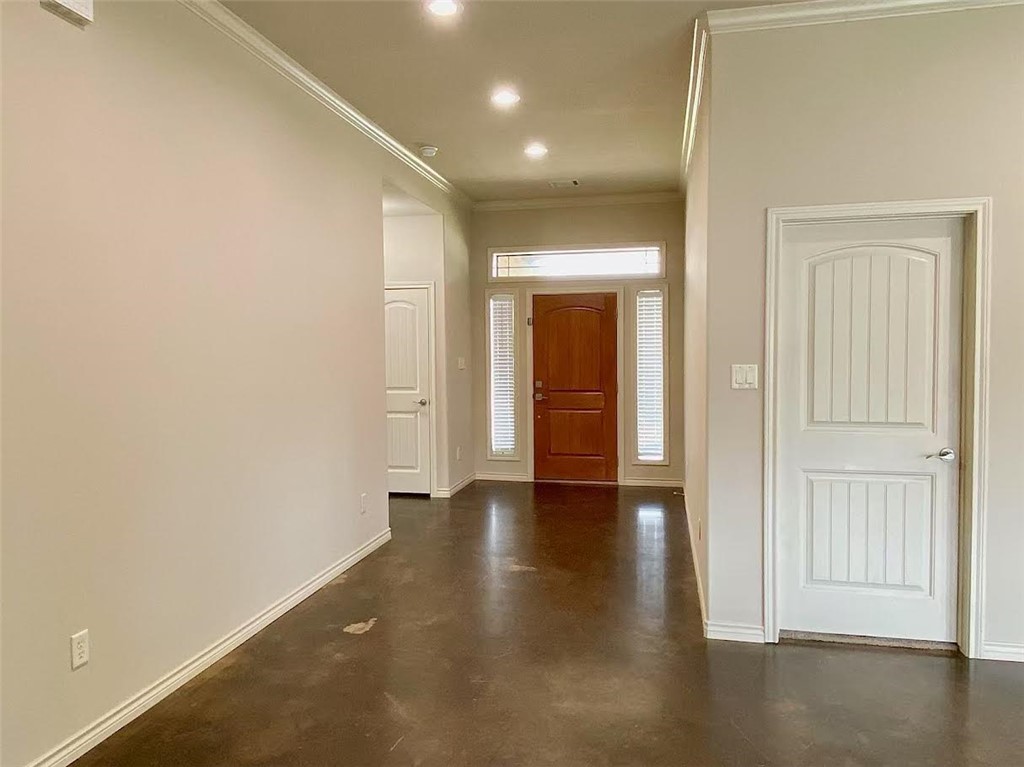 Move-in ready single-story home on a spacious corner lot in Edelweiss Gartens. Broad front layout with a long porch and extended hallway for an open feel. Living room features abundant natural light, high ceilings, stained concrete floors, and a cozy corner stone gas fireplace. Kitchen offers granite counters, stainless steel appliances, large island with bar seating, and a corner pantry. French doors lead to a covered patio with gas hookup, swing hooks, and a landscaped backyard with mature trees, garden beds, and play space. Rear-entry garage has built-in storage, workbench, and oversized utility sink. Laundry/utility room includes washer, dual dryer, fridge/freezer, and extra counter space. Primary suite has crown molding, walk-in closet, and spa-like bath with dual vanities, jetted tub, and dual-head rain shower. Tankless water heater. Recent upgrades: new architectural shingle roof (July 2025), fresh paint, adjustable LED lights, newer refrigerator, dishwasher, over-the-range microwave, single-basin kitchen sink, garbage disposal, garage utility sink, a smart irrigation, ring doorbell, and enhanced exterior lighting. Quiet neighborhood near park, schools, shops, and amenities. Photos courtesy of owner.