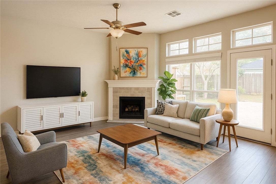 10-foot ceilings, creating a spacious and inviting atmosphere. The living area is enhanced with light wood-style flooring and a gas