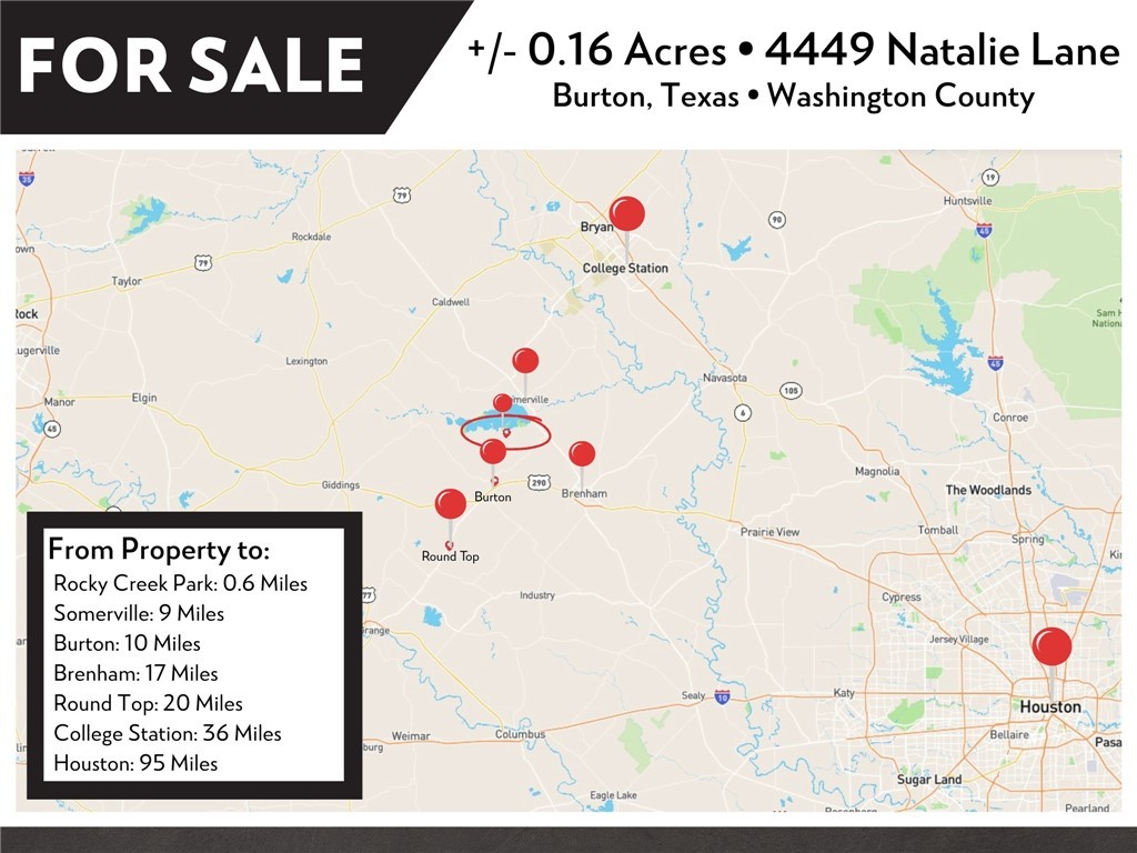 - Directions: From Brenham travel North on Highway 36, turn left onto FM 1948, left onto Longpoint Rd, left onto Natalie Ln. The property will be on the right-hand side of the road. There is a sign roughly in the middle of the lot, property corners are marked with pink survey flags.
