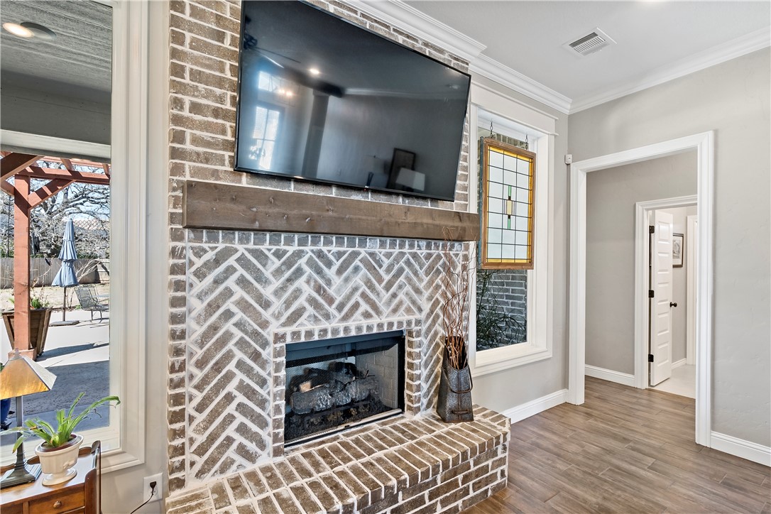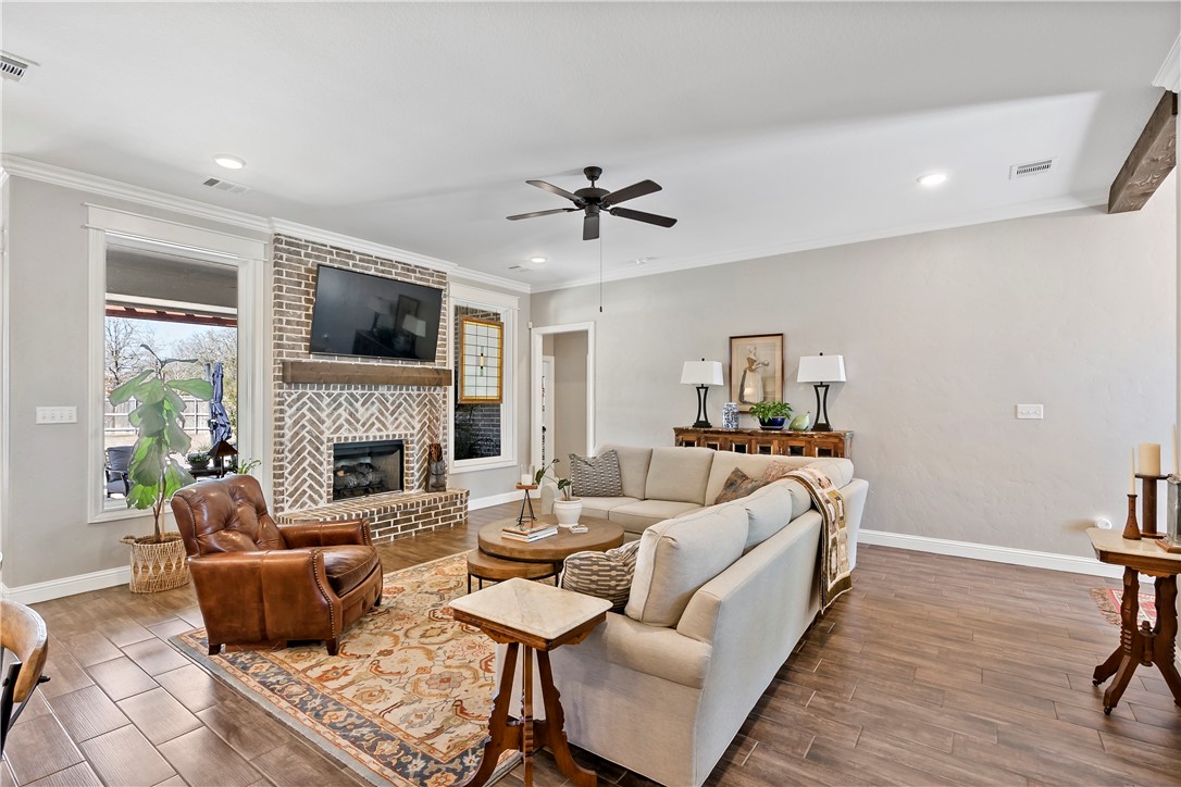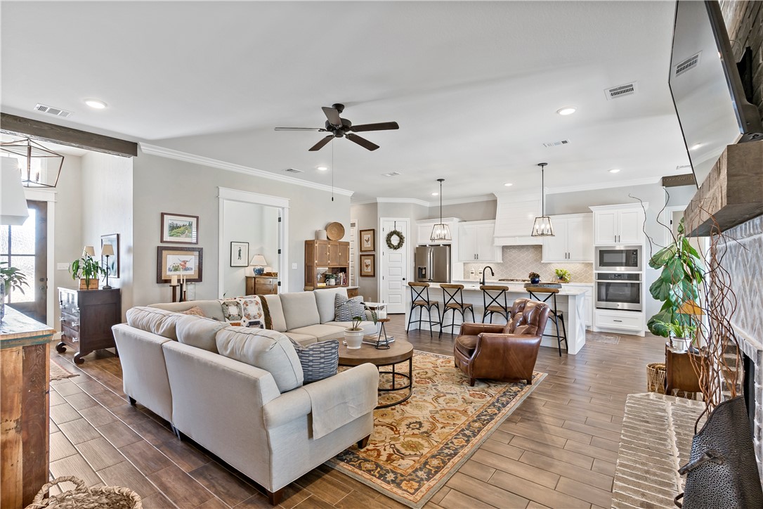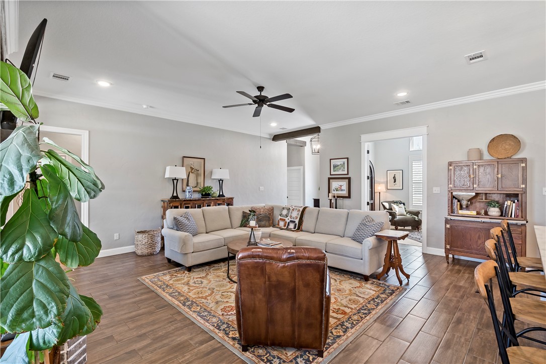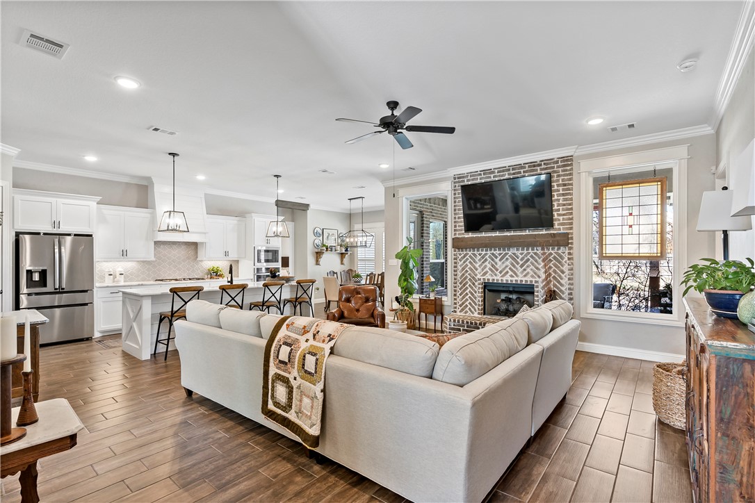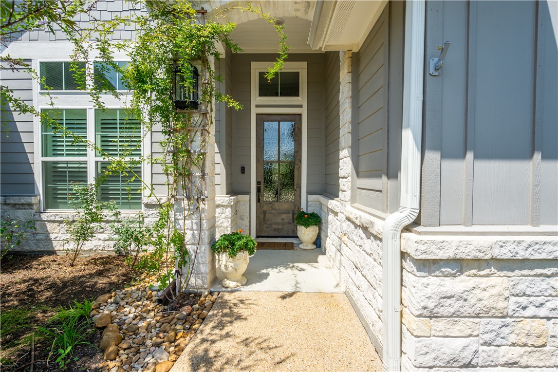 Luxury living in The Crossing at Lick Creek—where refined design meets timeless comfort. Backing to Lick Creek Park, this Magruder Home offers 4 bedrooms, 4 full baths, an office/flex room downstairs, and an upstairs bonus room with its own bath, all on a .39-acre corner homesite with mature landscaping and beds. Sunlit, open living/dining/kitchen showcases warm wood-look tile, custom lighting, plantation shutters, beam accents, and a herringbone brick gas fireplace. The designer kitchen centers on a seating-for-4 island with light custom cabinetry, granite, decorative backsplash, gas range, and built-in microwave/oven. A dedicated beverage/coffee bar with butcher-block counter and space for fridge adds everyday convenience. Three way split floor plan features - private primary retreat with soaking tub, glass walk in shower, dual vanities with sit-down space, plus storage. Primary closet showcases laundry access/pass through for ease. Two downstairs bedrooms share a full bath; a fourth bedroom enjoys an additional full bath. Upstairs, the carpeted bonus room with full bath flexes as media, game, or guest suite. Outdoor living shines with a pergola-covered patio, pool with natural rock waterfall, and yard space beyond for play or garden. Minutes to parks, schools, and South College Station amenities—schedule your private showing.