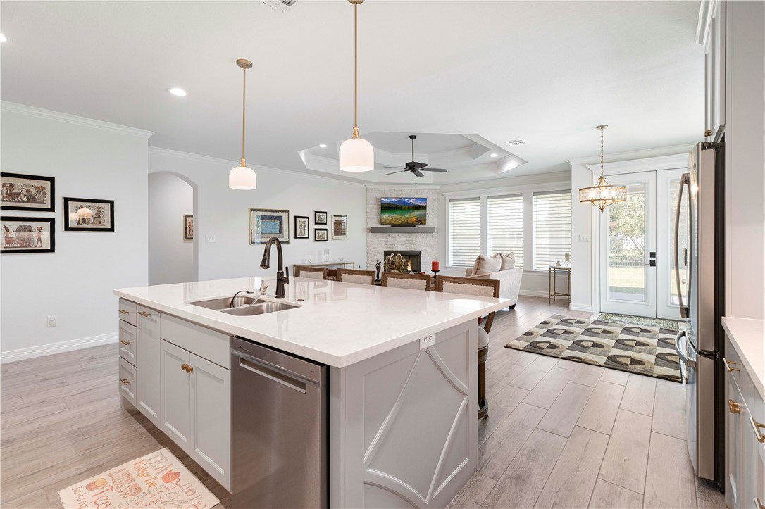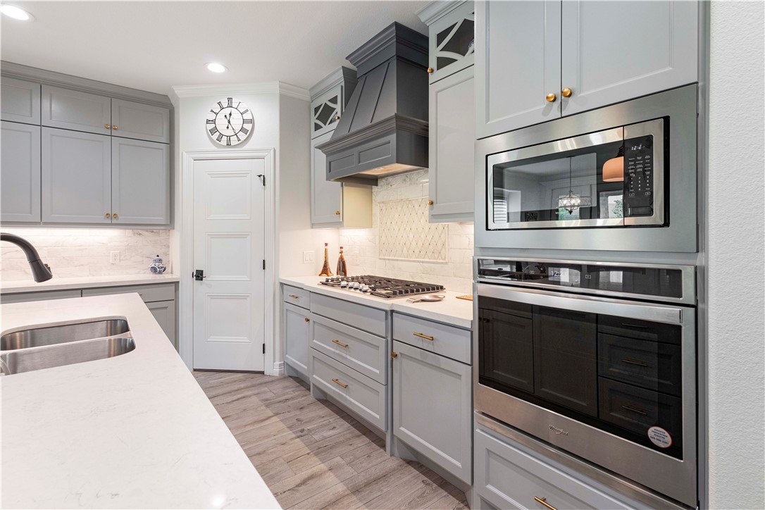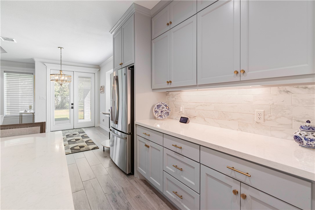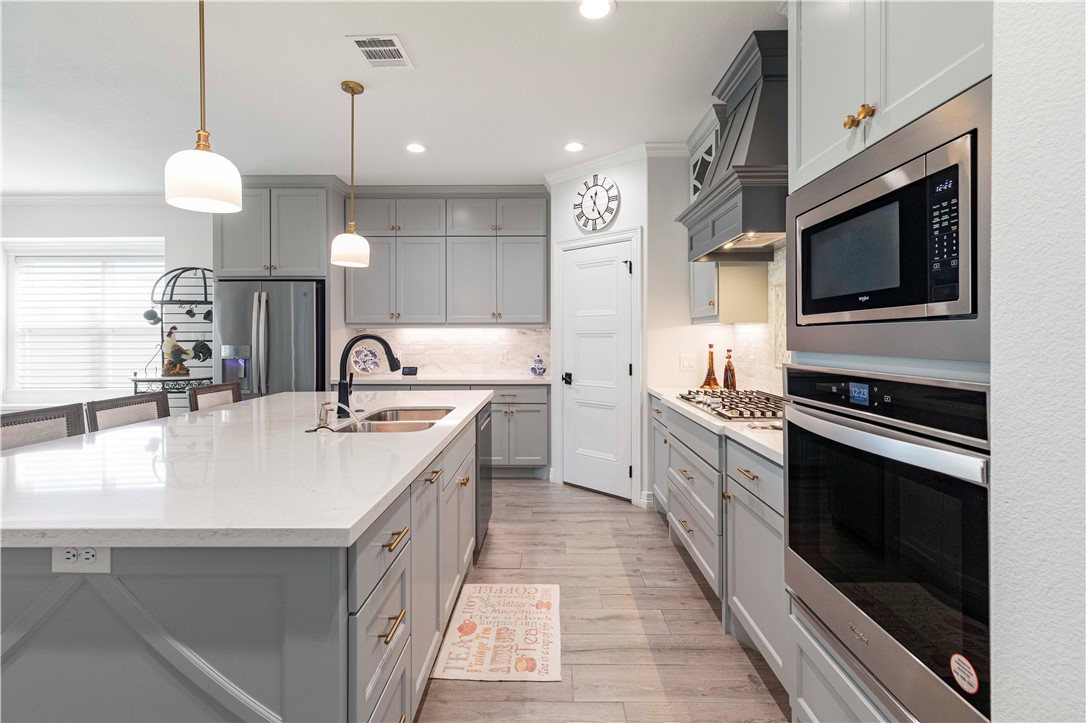 Luxury Living in Greens Prairie Reserve: stunning all-brick custom home on a quiet cul-de-sac in one of College Station’s most desirable communities, with top-rated schools. Inside you’ll find soaring 12-foot ceilings with crown moulding & beautiful wood-look tile floors throughout. The spacious living room offers a gas fireplace and large windows that fill the home with natural light. Gourmet kitchen has a large island, gas cooktop, 42" cabinets with glass inserts, and plenty of storage. The primary suite includes custom blinds, custom glass shower, dual marble vanities, private toilet area, and walk-in closet with direct laundry access. The covered patio with an outdoor kitchen is perfect for entertaining. Additional highlights include a water softener and Stampede™ coating on the porch, patio, driveway, garage, and walkway. Greens Prairie Reserve offers over 12 miles of trails through 370 acres for you to explore and provides access to pocket parks, ponds, and the community center.