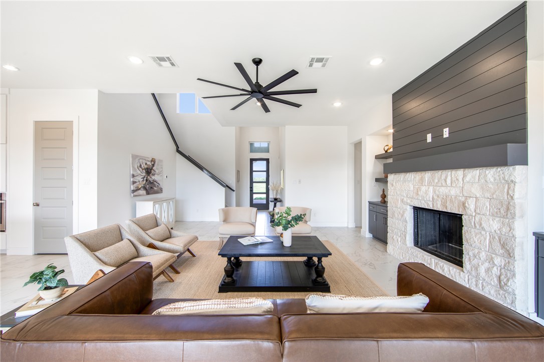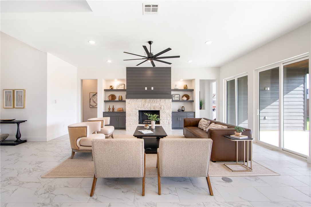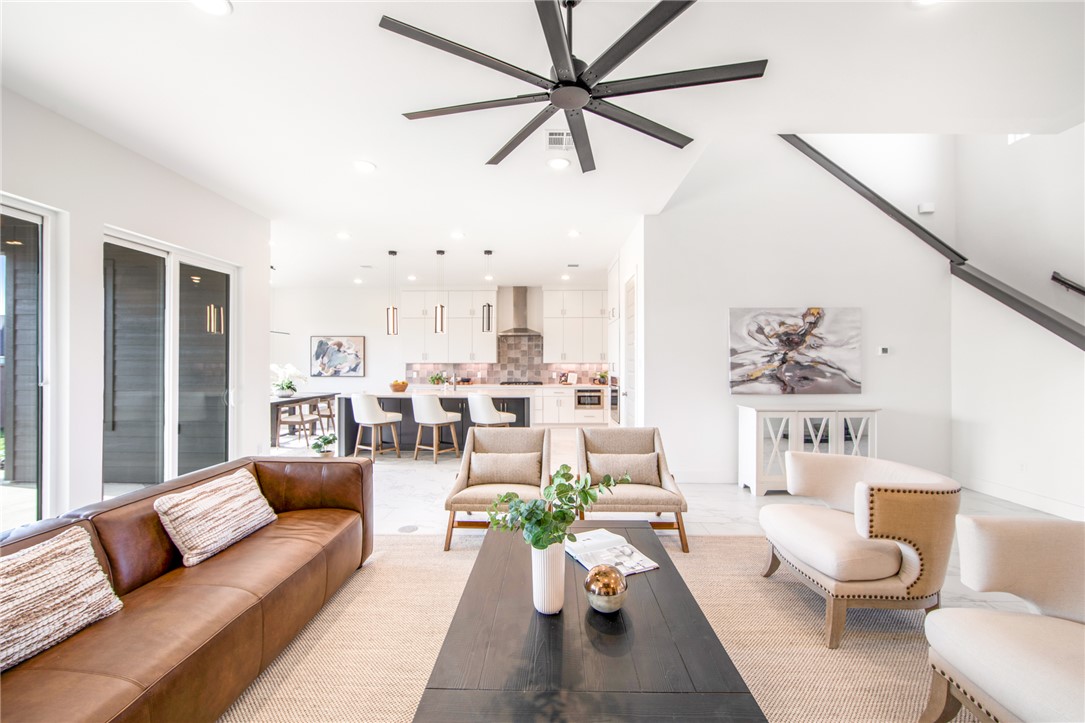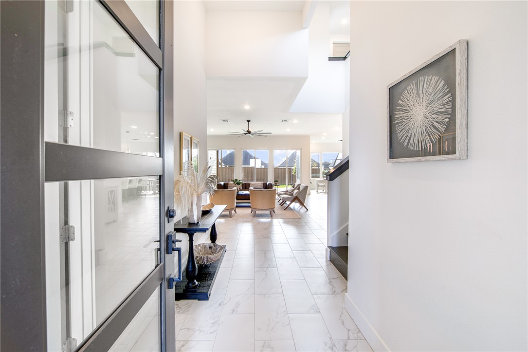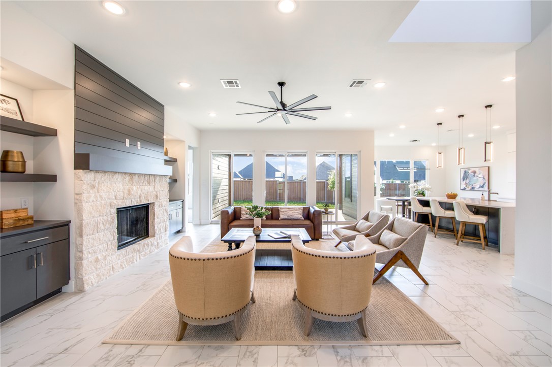 added storage. The living room features an open concept with quad sliding glass doors that connect to the oversized back patio where you can entertain guests with outdoor living area. Two car garage, study on the first floor & a game room & flex space on the second floor. Greens Prairie Reserve offers over 12 miles of trails through 370 acres for you to explore the surrounding nature and provide access to pocket parks, ponds, and The Pavilion, their community event center.