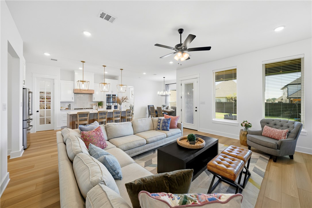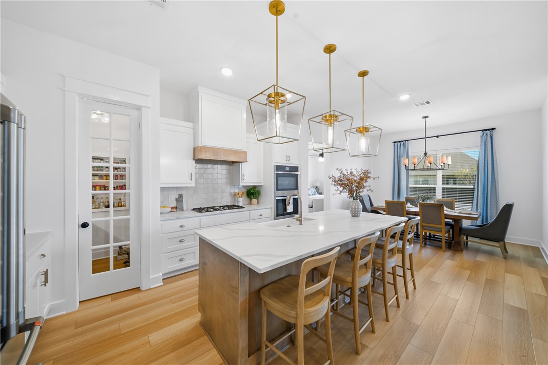Modern and functional, this stylish 3-bed, 3.5-bath home with a dedicated office offers a luxury feel and a highly efficient floor plan. The open-concept layout flows seamlessly from living to dining to the designer kitchen—featuring a large island, stainless steel appliances, pendant lighting, and a striking backsplash. A butler’s pantry adds additional storage and prep space that is not found in many other homes. The light-filled primary suite includes a spa-like ensuite bath with dual vanities, a soaking tub, a walk-in tiled shower, private water closet, and direct access to a spacious walk-in closet that connects to the laundry room. Each secondary bedroom has its own private bathroom. A stylish half bath and a separate office complete the interior layout. Enjoy outdoor living with a covered patio and outdoor kitchen. With high-end finishes throughout, this home is modern, comfortable, and feels like new. Residents can enjoy a coffee bar cafe, fitness center, resort-style pools, playgrounds, parks, sport courts at Oakmont's Amenity Center. Throughout the neighborhood there are scenic trails and sidewalks to enhance an active lifestyle.