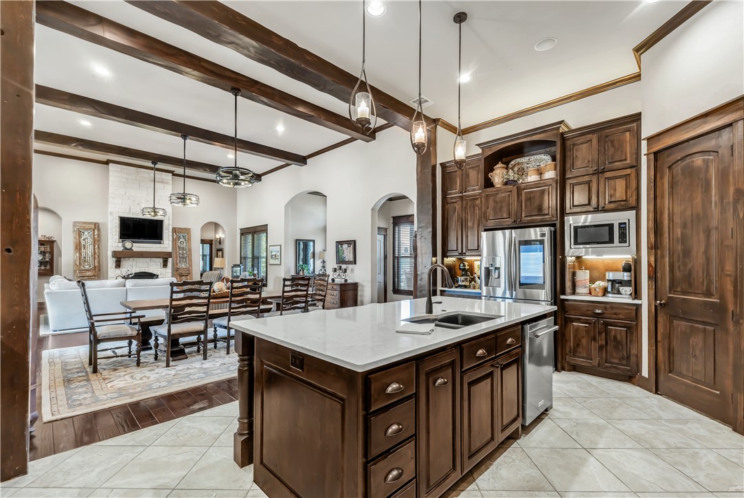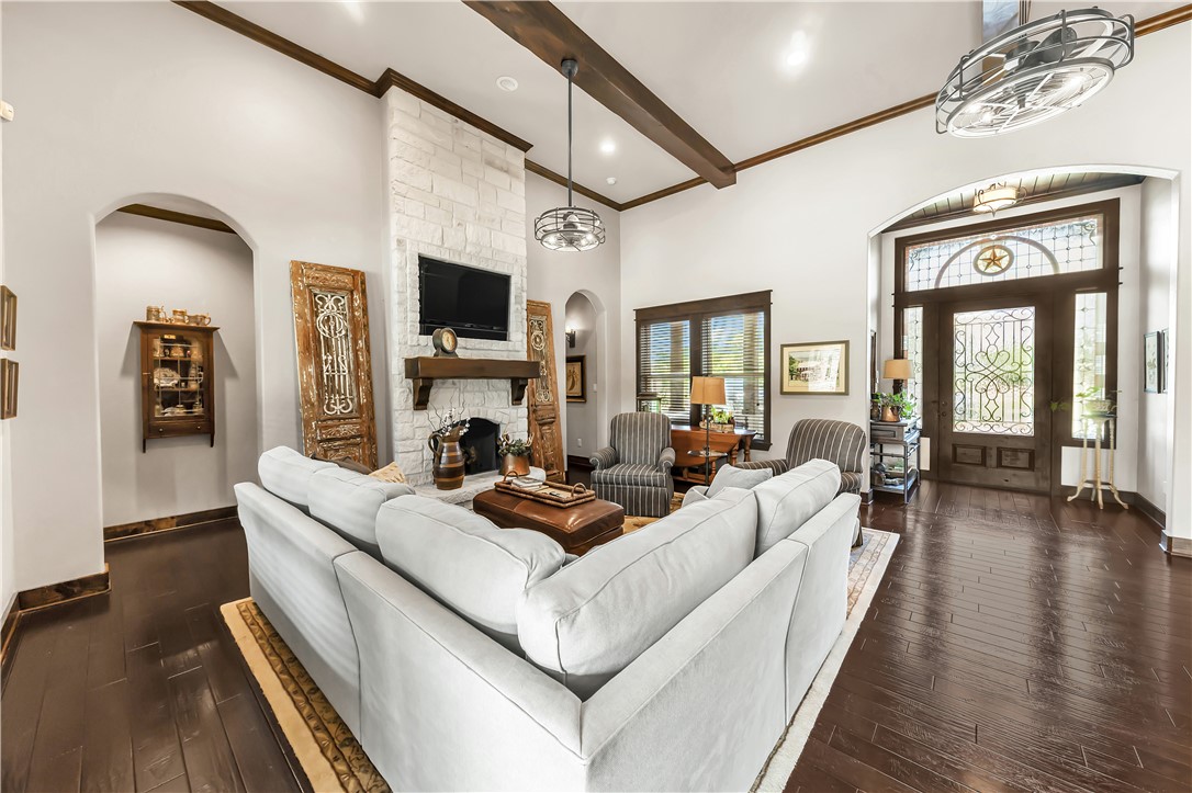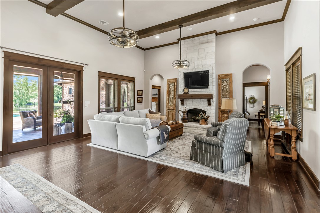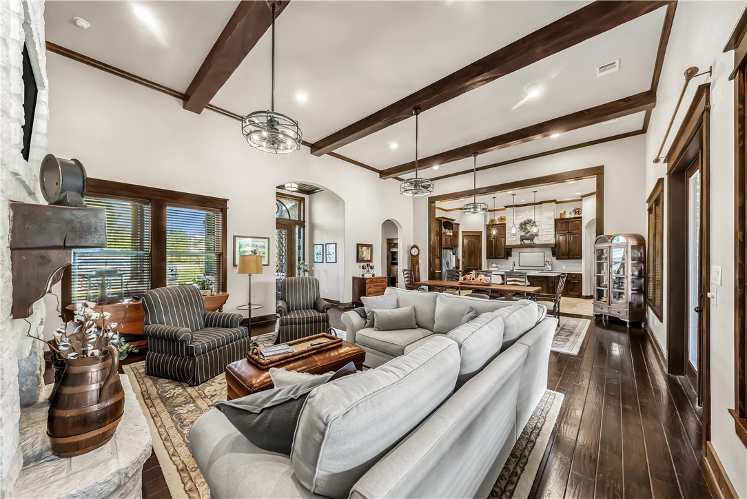 This home truly has it all! Nestled on a sprawling 1.48 ACRE CUL-DE-SAC LOT, enjoy a well-stocked PRIVATE POND, sparkling POOL & SPA, and OUT DOOR KITCHEN & COVERED PATIO with Sunbrite TV perfect for entertaining. Inside, the 2,841 sq ft home (built in 2014) OPEN CONCEPT HOME offers 4 bedrooms, 3.5 baths, and a 3 CAR ATTACHED GARAGE plus a 1 CAR DETACHED GARAGE and a half circle drive along with additional driveway to the side of the home. Designed as a forever home, no detail was overlooked: quartz countertops, 15’ ceilings in the island kitchen and family room with beautiful wood beams, sink in utility room, spray foam insulation, 2 tankless gas water heaters, aerobic system, and a buried propane tank. Upgrades include Zoysia grass with full irrigation, fiber optic internet, 30-amp RV hookup, and a storage shed on slab with electric and water. NEW ROOF too! This one is a must-see!