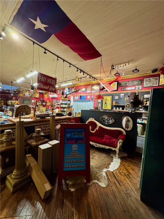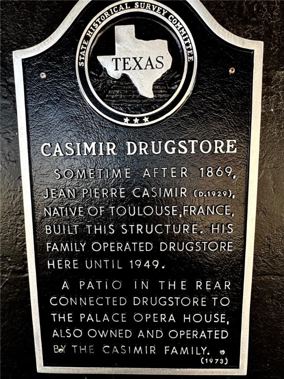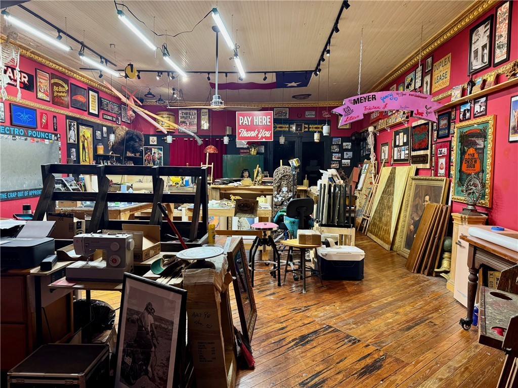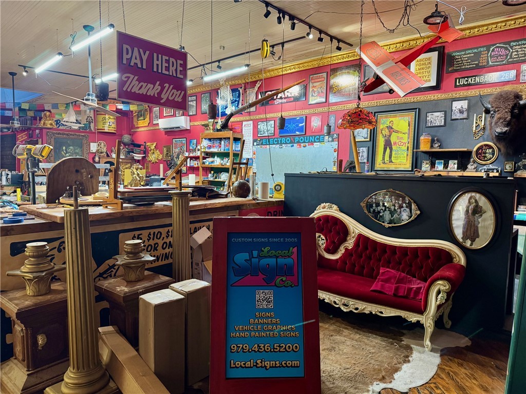 Opportunity to own historic commercial building in Calvert’s Historic 8-Block Business District on the National Registry. Originally built in 1869, this historic building first operated as the Casimir Drugstore until 1949. Today, the building is the working studio and headquarters for international sign painter, Starr Studios. Spaces throughout the property have been designated to showcase the artist’s collections, as well as workspaces for gilding, restorations and sign painting. The property also includes living quarters, yoga/meditation space, and garage for custom painted art and lettering as seen on HGTV’s Junk Gypsy's VW bug. The building was once home to a bar/dance hall where guests gathered for frosty beverages w/friends. Original diagonal wood floors can be seen throughout the 3750 sq. ft. space. Multiple rooms and areas can be used as more retail space, storage, living quarters and more. The front room has a large retail/showroom and counters along with working areas. The back room/garage has a concrete floor with an alley exit door at grade. The property also boasts two roof windows/skylights for natural light and a special feature in historic buildings. Approx. halfway between College Station/Texas A&M and Waco/Baylor, this property is conveniently located in one of the state's largest historic districts on the National Registry. The building is an investment opportunity with the potential for retail, art studio, office, or hospitality in Calvert’s 500 block.