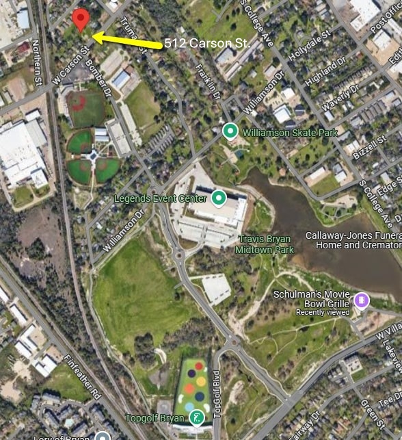 Great mixed use commercial property, may be combined with 500 Carson. Development of 4 bedroom / 4 bathroom townhouses may be allowed on this tract - contact an agent for details. This 1.06 acre lot is located at the north entrance of the $70M+ Midtown Park! This property features over 180’ of road frontage on Carson and the rear property line is 350' wide. The lot is mostly open with a few trees and completely fenced around the preimeter. High-speed fiber optic internet cable recently installed on property - ready to be incorporated into your design. Across the street from Bombers Ballpark and the beautifully renovated & award winning Travis Fields. Travis Bryan Midtown Park is an emerging economic engine featuring the Legends Event Center, Topgolf, Travis fields, & Bombers Ballpark. Additional amenities include the Schulman entertainment complex (opens mid 2026), a multiplex movie theater, 24 lane bowling alley, microbrewery/restaurant, pickleball courts - all fronting on a lakefront boardwalk. Nearly weekly softball/basketball/volleyball tournaments currently drawing thousand of visitors. This has the potential for development into an outstanding mixed use commercial/residential property and may represent one of the strongest available redevelopment plays in the region!