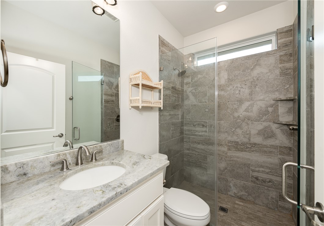 The spa-inspired primary bathroom is a luxurious retreat, boasting a large walk-in shower enclosed in frameless glass, a soaking tub, and a beautiful vanity area with ample natural light streaming through frosted windows. The primary bathroom flows into the primary closet that connects to the laundry room.