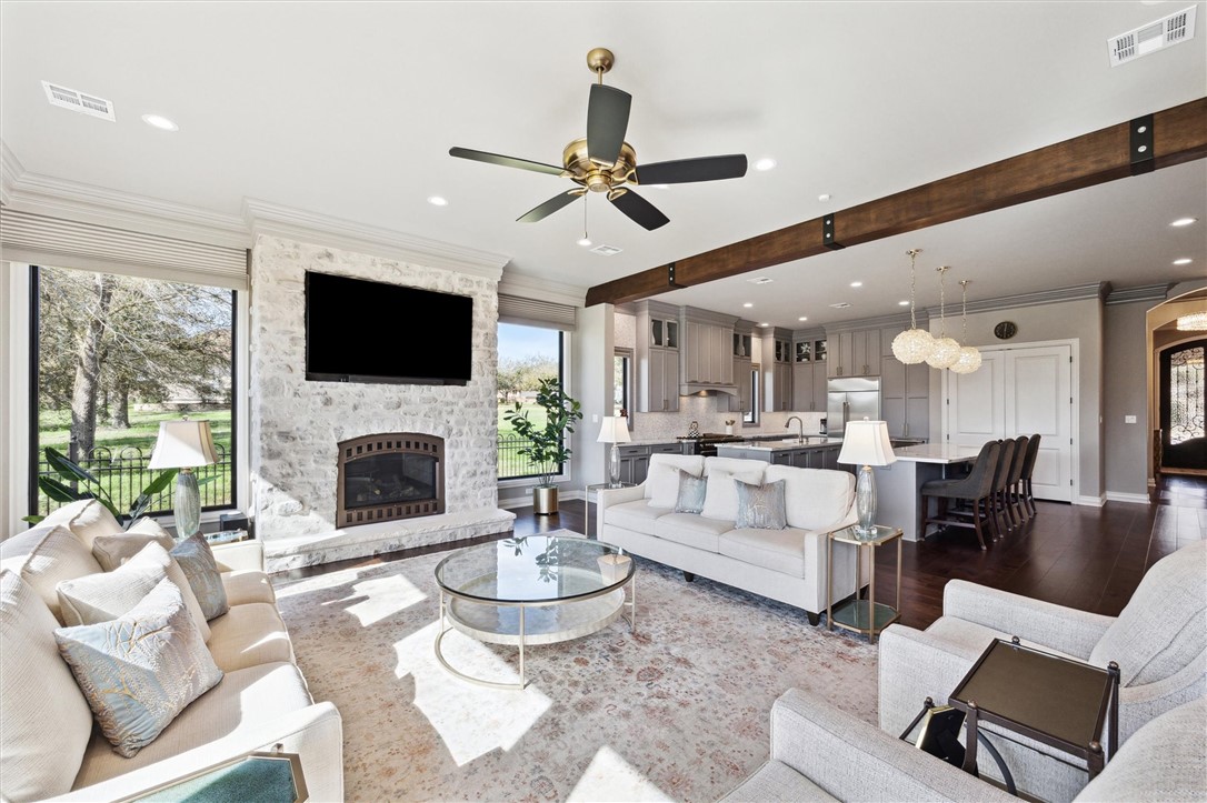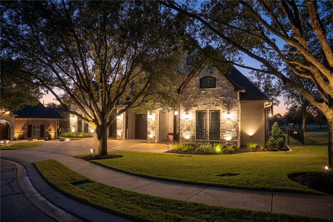 This stunning luxury home within Miramont sits on a 180-degree view that stretches from Miramont Club House to the serene Lake Heron and backs directly onto Tee Box #9! Perfect for entertaining and golf enthusiasts! The living room boasts 11-ft ceilings, a stone gas fireplace, and wall-to-wall windows framing the golf course view. The gourmet kitchen features 60" 6-burner Hallman range, dual granite islands, Cafe Series refrigerator, warming drawer, and wine fridge. The dining room impresses w/ a beveled mirrored wall and Allegri chandelier, while the wet bar glows w/underlit granite, a unique Thompson vessel sink, and a Swarovski crystal chandelier. The main study overlooks Tee Box #9, with a 2nd study nook hidden behind French doors. The oversized Primary Bedroom overlooks the golf course, while the primary suite is a spa-like retreat with a jacuzzi tub, oversized shower, and large walk-in closet. Off the 3-car tandem garage is a temperature-controlled flex room for exercise or storage. Step outside to an entertainer’s paradise featuring a Coyote BBQ grill, a granite bar, a cozy fire pit, and a covered patio with 11 barstools—all perfectly positioned to enjoy the stunning golf course backdrop. Additional highlights include Hickory wood flooring, smart-controlled electric blinds, smartphone-controlled sprinkler system, stonework, and garage equipped for EV and golf cart charging. This home seamlessly blends luxury and convenience in the heart of Aggieland.