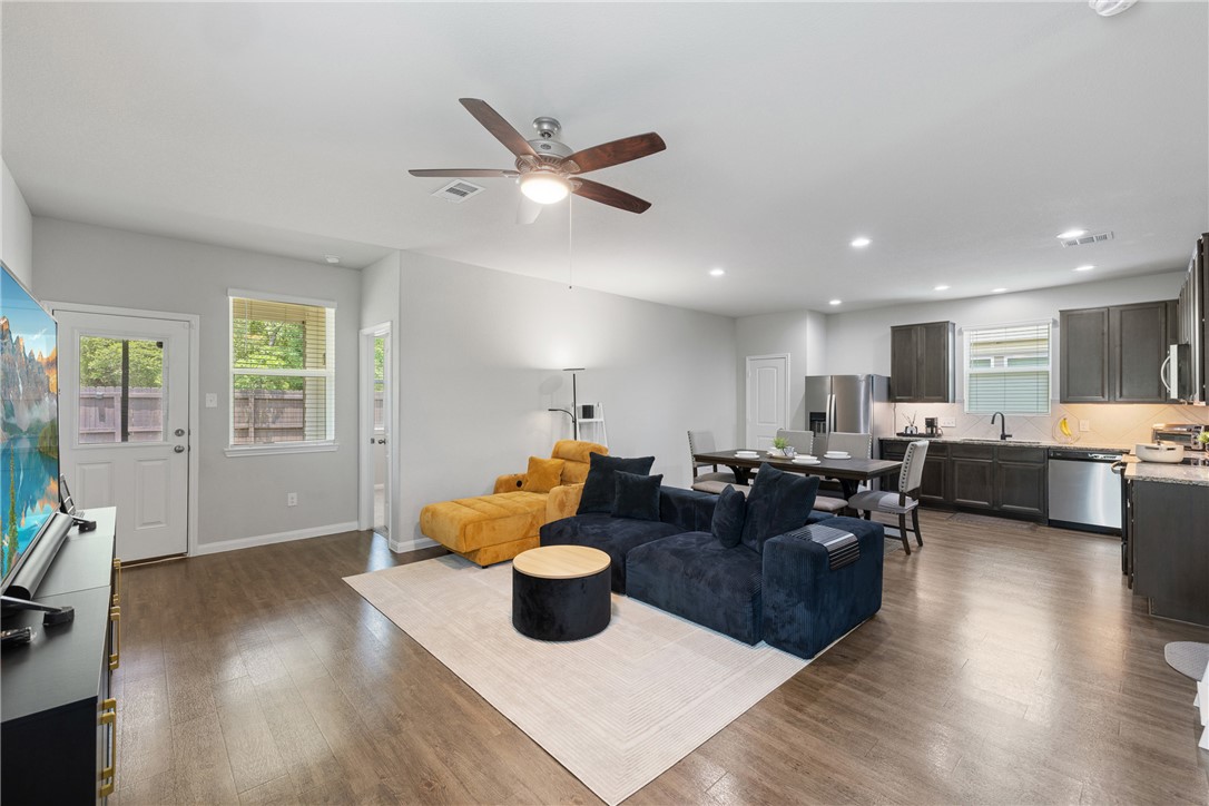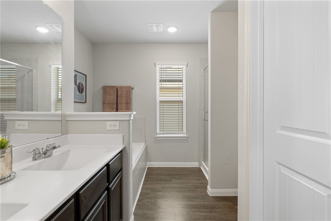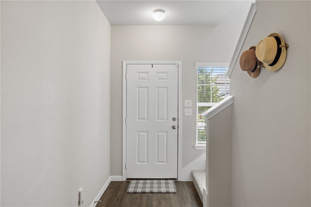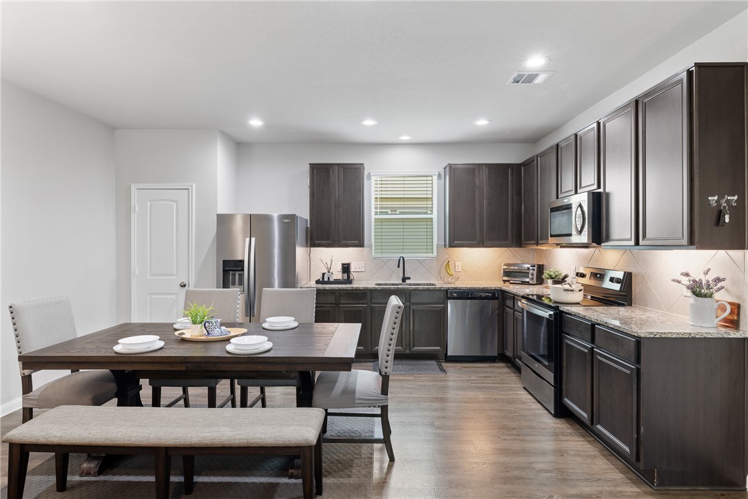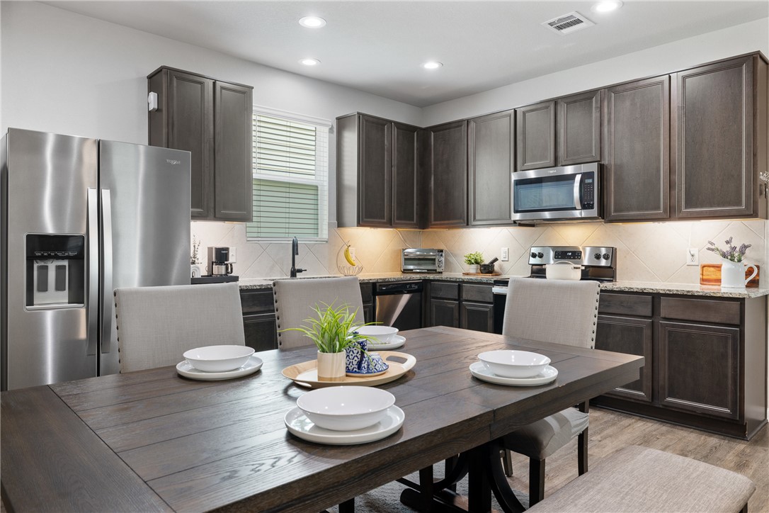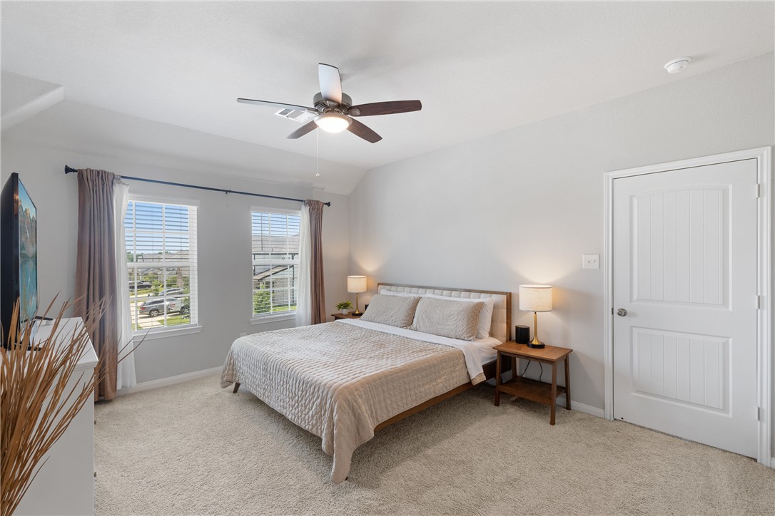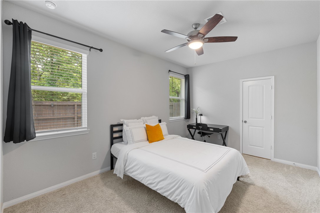 Immaculate and exceptionally well maintained, this 4-bedroom, 3.5-bath home offers space, privacy, and convenience in a prime Bryan location—just minutes from Texas A&M University and the expanding RELLIS campus. With no rear neighbors and a tree-lined backdrop, the covered patio provides a peaceful space to enjoy nature right from your backyard. Inside, you'll find a bright, open layout with durable vinyl flooring, spacious living and dining areas, and a large kitchen featuring granite countertops, under-cabinet lighting, and stainless steel appliances. Refrigerator, washer, and dryer all convey. The home includes two bedroom suites—one downstairs with a private ensuite bath, and a spacious upstairs primary retreat with a soaking tub, separate shower, dual vanities, and a huge walk-in closet. Two additional bedrooms and a well-placed half bath complete the layout. Additional upgrades include full gutters, 2” blinds throughout, three bidets with remote controls, smart garage door opener, and a full sprinkler system. Spacious, move-in ready, and thoughtfully appointed—this home blends comfort, privacy, and location in one great package.