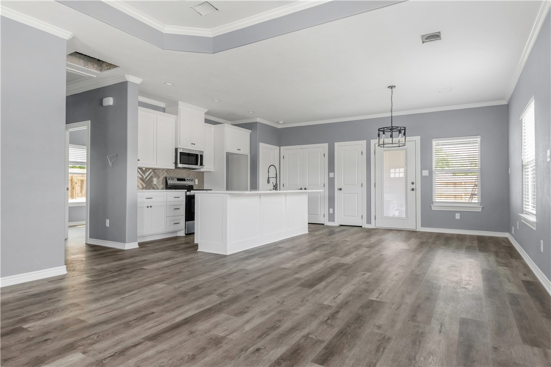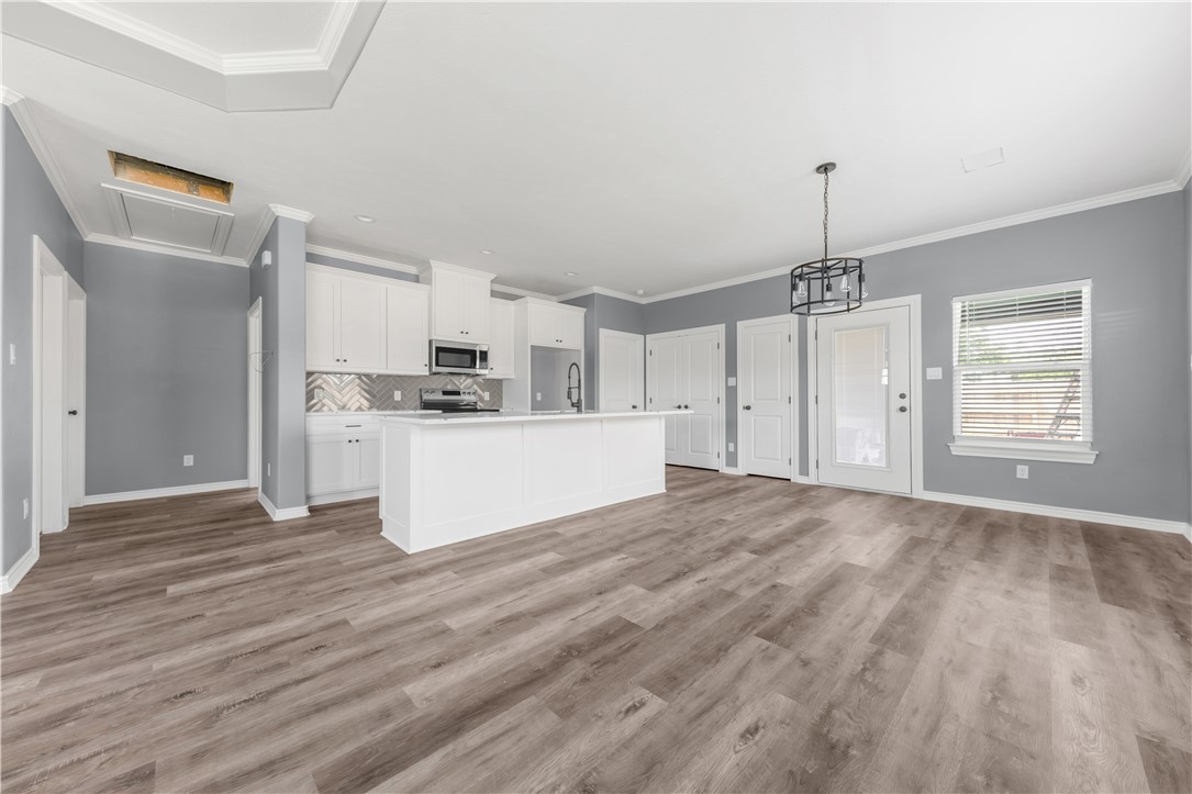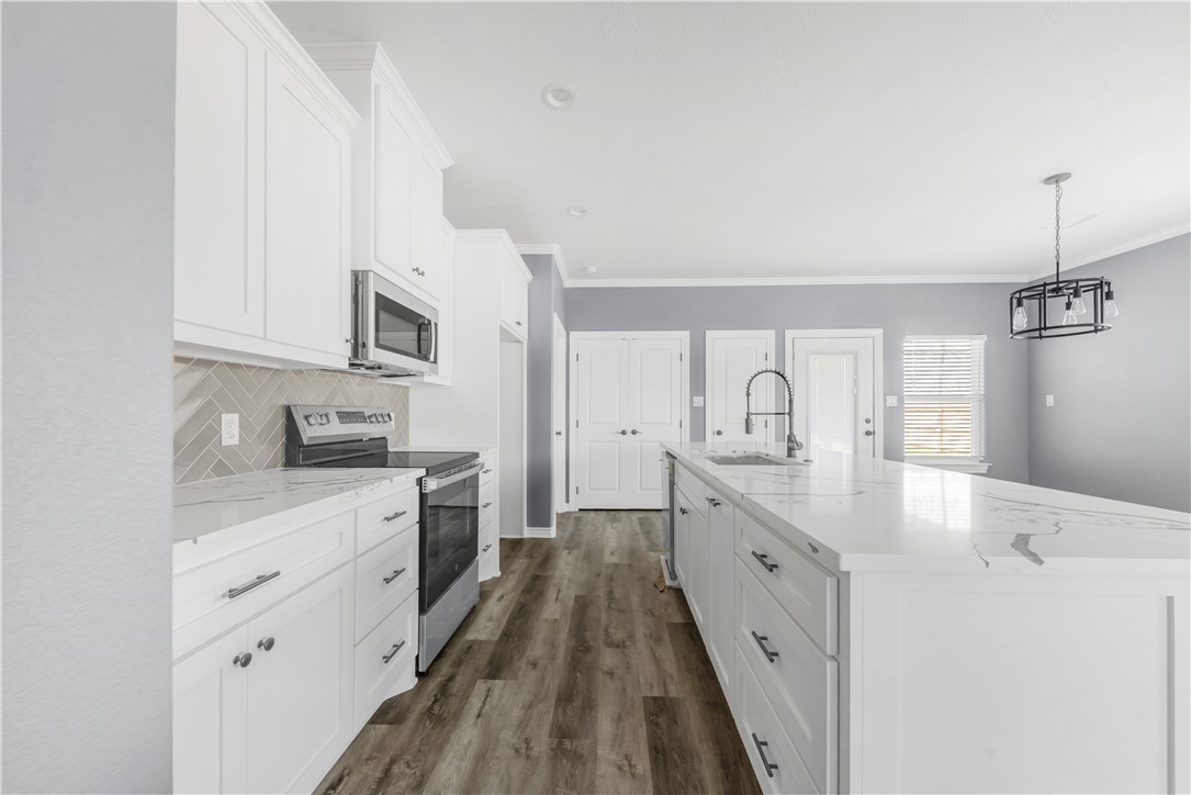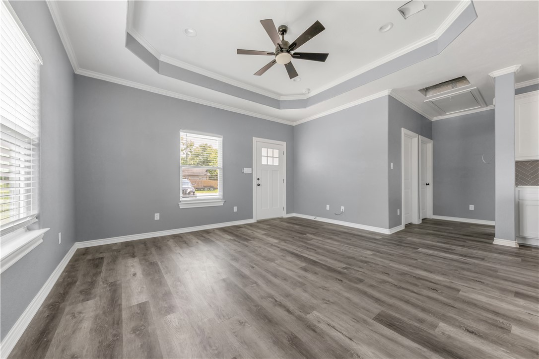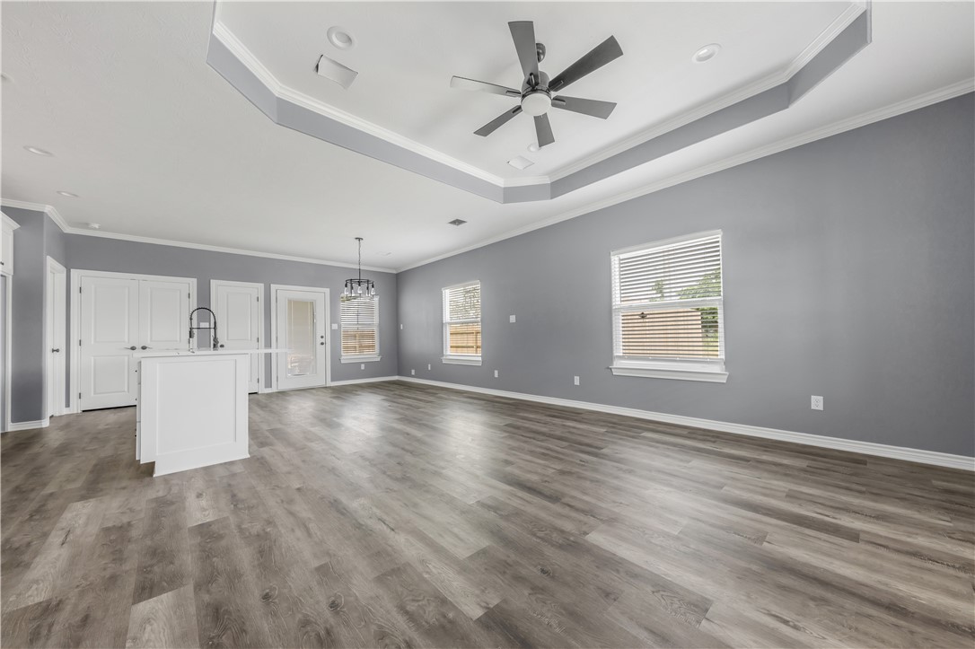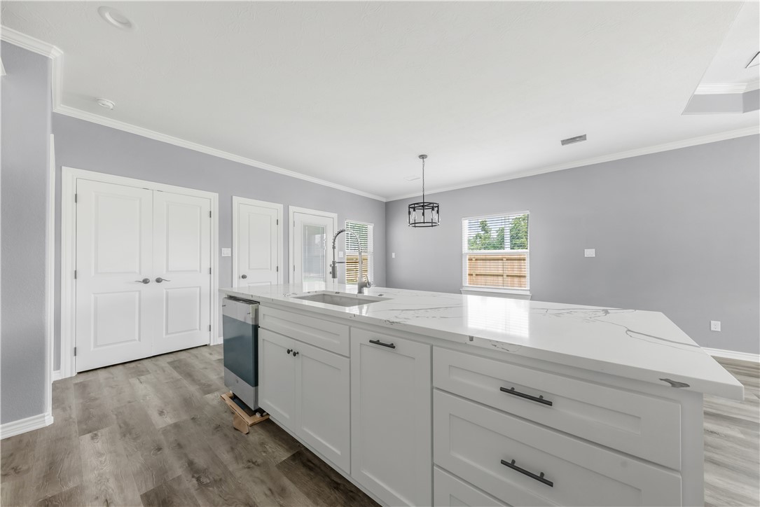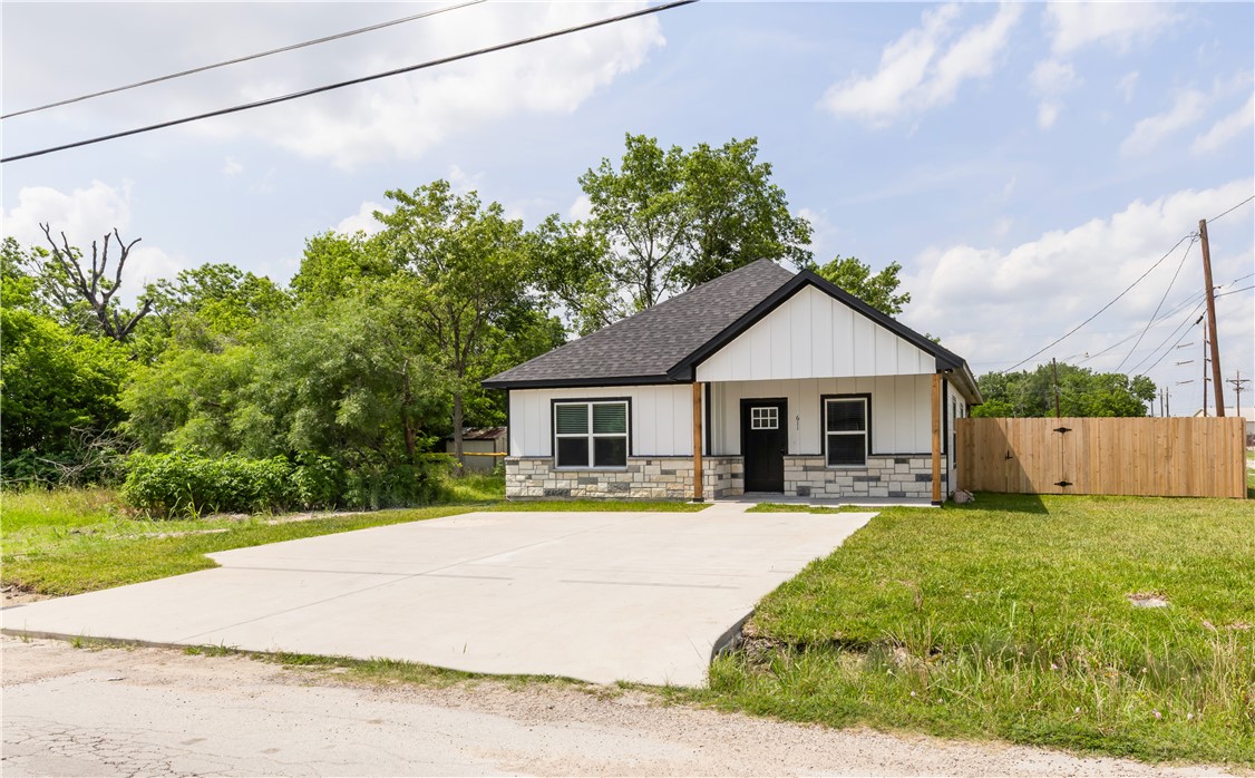 Nestled in the heart of Navasota, TX, this delightful 3-bedroom, 2-bathroom home combines contemporary amenities with a prime location near vibrant downtown shopping and dining. This residence offers an open and inviting atmosphere, perfect for enjoying the comforts of small-town living while staying close to all urban conveniences. Step inside to discover laminate flooring seamlessly flowing throughout the home, providing an elegant and low-maintenance backdrop for your lifestyle (no carpet). The open concept floor plan is highlighted by an expansive kitchen featuring a large island with stunning quartz countertops, offering ample space for culinary adventures and casual dining. The primary suite includes a lavished fully tiled tub/shower combo, creating a spa-like experience at home. The secondary bathroom offers practicality with its convenient tub/shower combo. Architectural details such as tray ceilings in living room and primary bedroom add a touch of sophistication, enhancing the airy ambiance of this charming abode. Situated on a desirable corner lot, the home boasts a privacy fence, perfect for enjoying your outdoor spaces in seclusion. An oversized driveway ensures plenty of parking, while the front patio and covered back patio provide perfect spots for relaxation and entertainment. For those seeking a harmonious blend of modern comforts and small-town charm, this Navasota home is a must-see (NO HOA!). Contact an agent today to schedule your private tour.