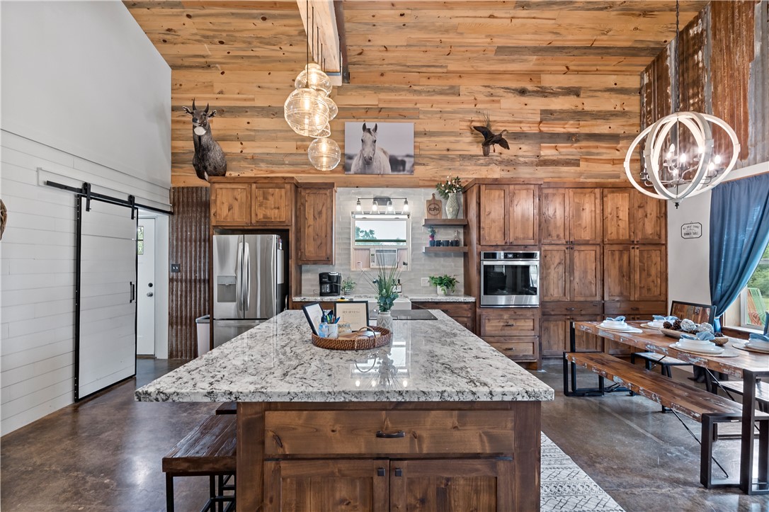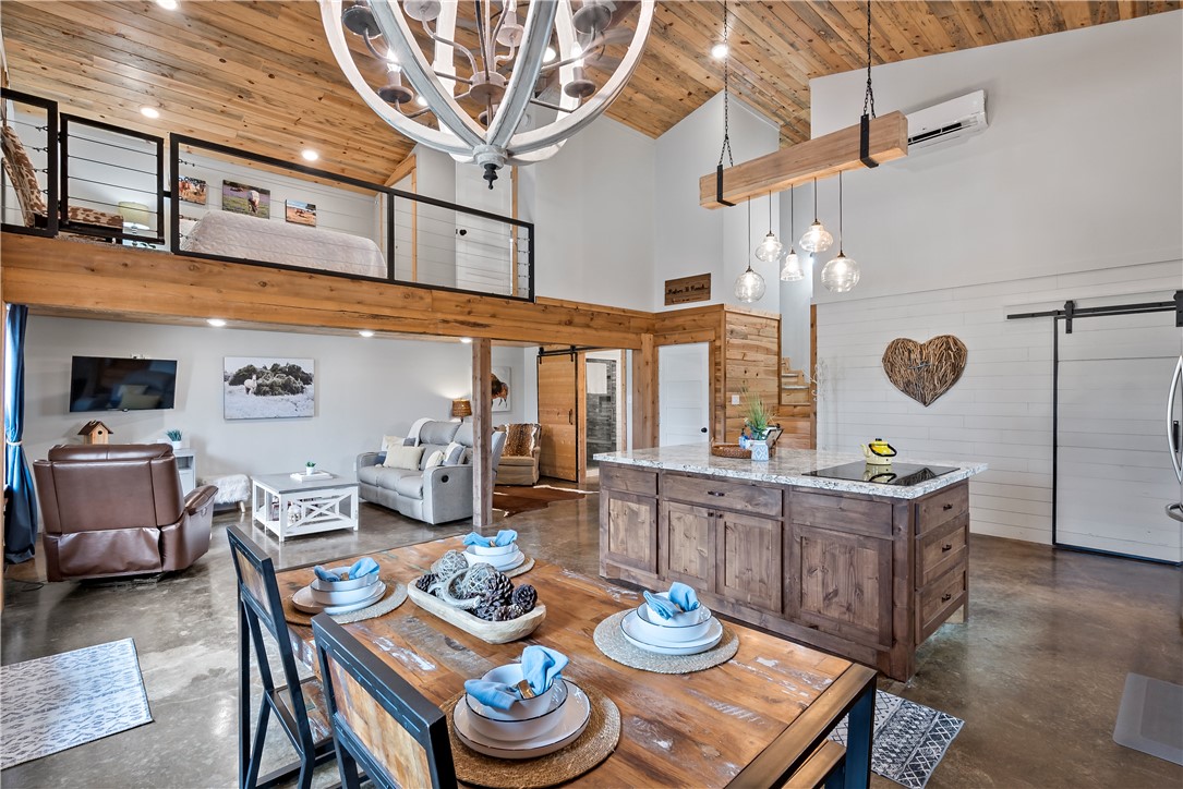 Step inside to a welcoming open-concept layout, highlighted by stunning concrete floors and a vaulted ceiling with rich, solid wood detailing. The kitchen is a chef’s dream, complete with solid wood cabinetry, granite countertops, and ample space to entertain. A luxurious walk-in tile shower is the centerpiece of the primary bathroom. The home also boasts a generous laundry room and an expansive storage closet upstairs, providing plenty of space for organization and convenience.