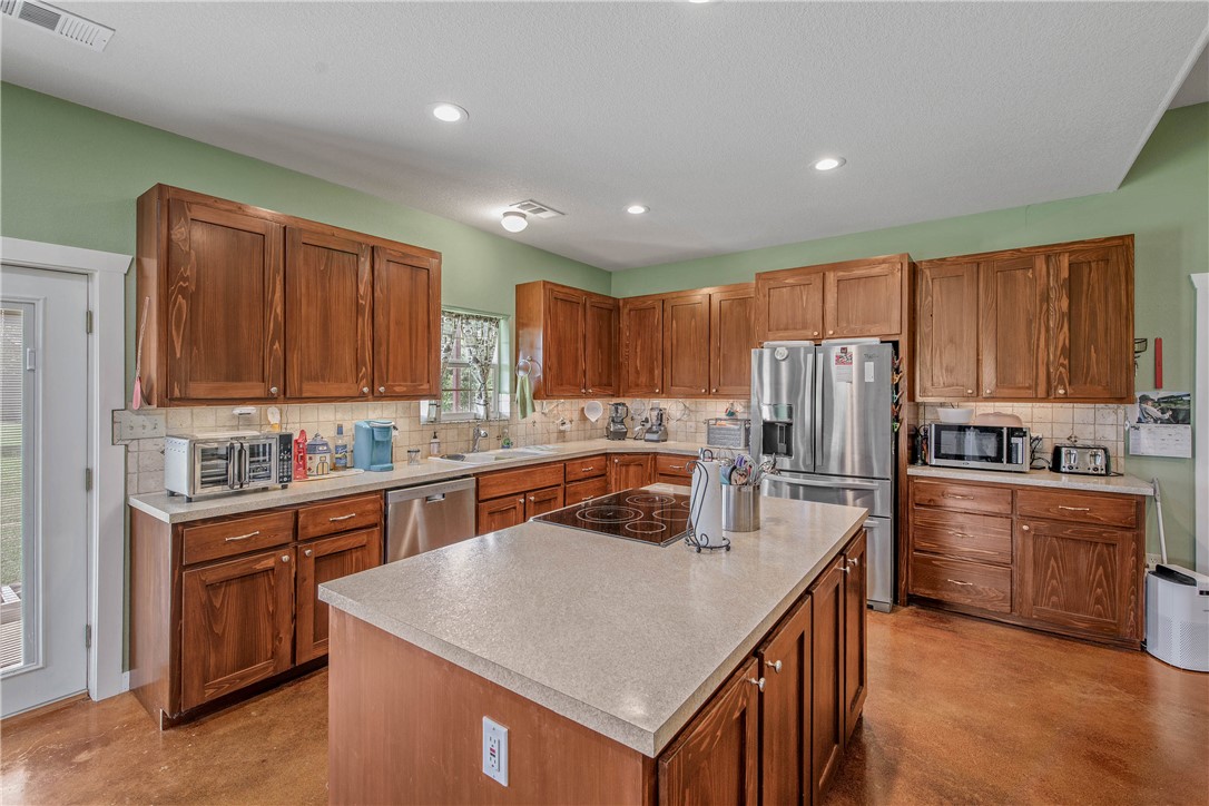 12.98 acres in Milano with Hwy 79 frontage, two homes, barns, and a stock tank. The main home is a 3,200 sq. ft. triple wide modular with 4BR/3BA and an open layout with updated kitchen and living areas. The second home is a 2,000 sq. ft. site-built residence with 2BR/2BA, stained concrete floors, and covered front and back porches. Improvements include a 40x50 metal barn and a 24x32 metal barn, both on concrete slabs with electricity, overhead doors, and walk-through doors. Land features open pasture, beautiful scattered oaks, and a small stock tank at the back. This very well-maintained property has an ag exemption in place and is ideal for multi-generational living, rental income, or small ranch operations.