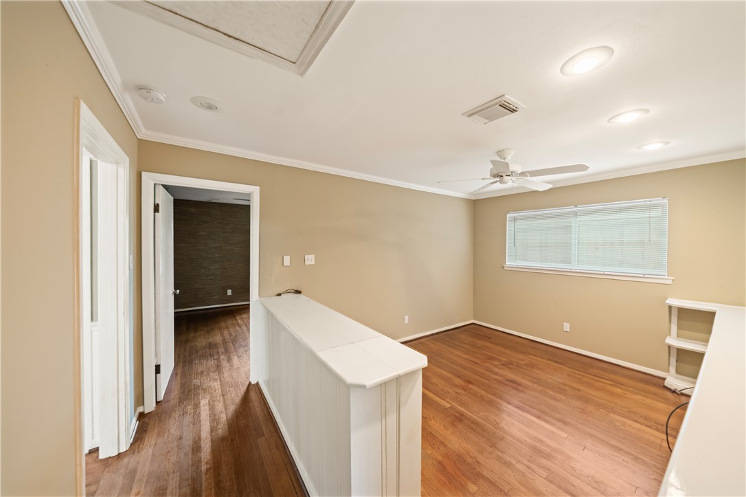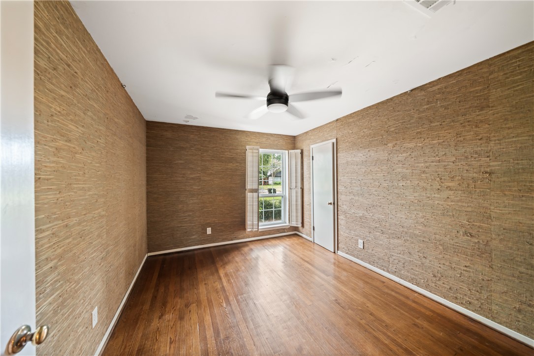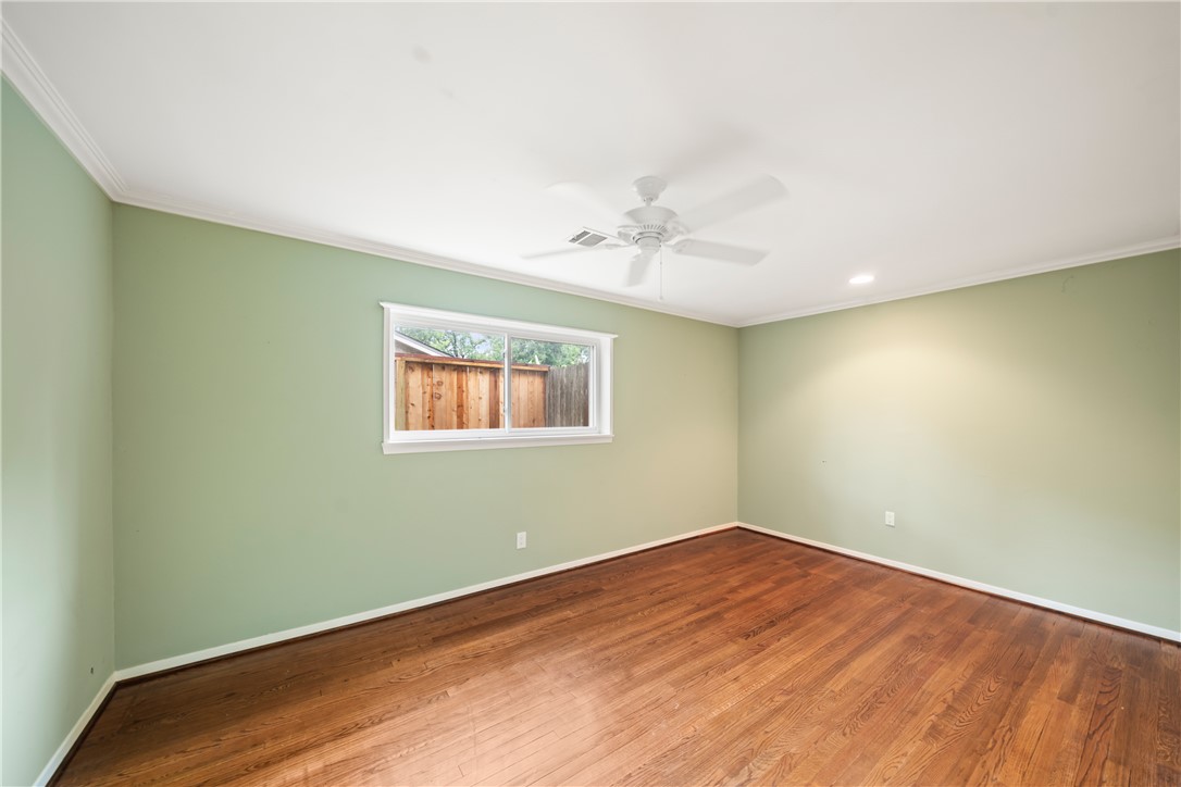 Charming and thoughtfully updated one-story in Northwest Houston, featuring flexible living spaces and quality improvements throughout. The open-concept den offers vaulted ceilings, real wood floors, a skylight, built-ins, dual ceiling fans, and a stately faux fireplace. The remodeled kitchen is equipped with custom cabinets, granite countertops, a tile backsplash, a gas LG range, and a stainless-steel refrigerator. Both bathrooms have been fully renovated, and the oversized primary suite includes a spacious closet. Upgrades include a 2020 water heater, PEX plumbing, newer thermostat, gutters, and a sprinkler system. The large covered back patio features tile flooring, recessed lighting, and a ceiling fan—ideal for entertaining. The backyard is fully fenced with mature landscaping and a producing fig tree. Brick flooring in select areas, updated windows, and classic curb appeal complete this move-in-ready home.